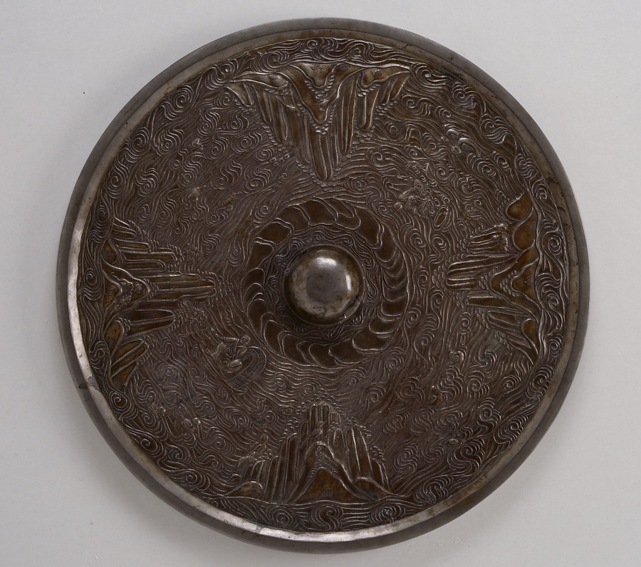 鏡の四方からは中心に向かって4つの山がそびえたち、その間は波の文様で埋められています。海磯鏡、つまり海と磯を表した鏡という名前ですが、波間にはオシドリの姿があるため、川や湖を表わしたものでしょう。島々にはオナガドリやトラ、シカなどが雄雌のつがいで表され、波間には船に乗って釣りをする人物や流木に乗る人物が見えます。こうした文様は聖なる山々と仙人たちをテーマにしたものと考えられ、古代の人々が憧れた平和で豊かな世界を見てとることができます。