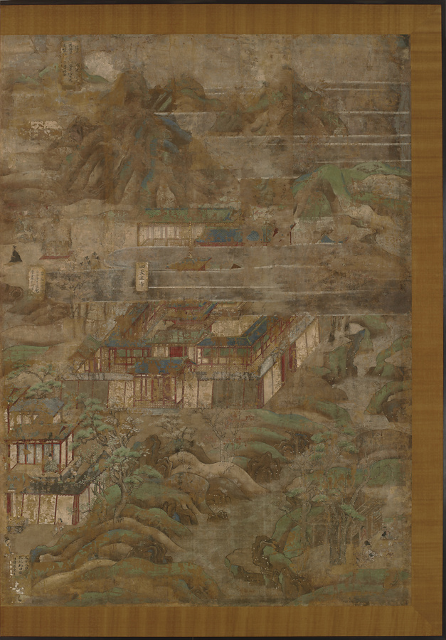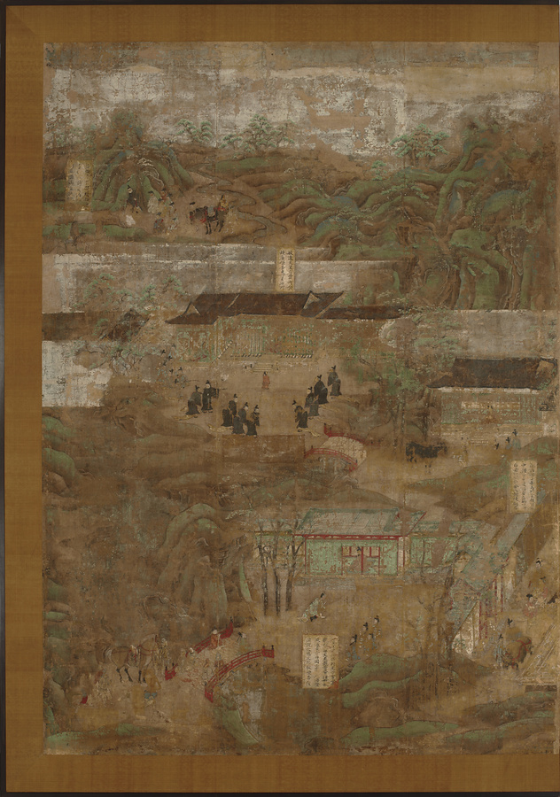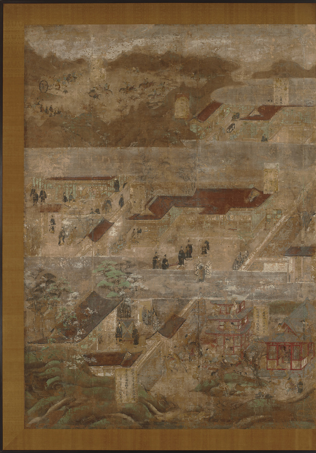 画面には太子の住んだ奈良・斑鳩のあたりを中心とした壮大な自然景観がパノラマのように展開されており、その中に60近い物語の場面が配置されています。それぞれの場面には簡単な説明を記した色紙形が貼られています。向かって右側は飛鳥地方から富士山のある静岡・山梨まで。左側には大阪の四天王寺から海を隔てて中国まで描かれています。