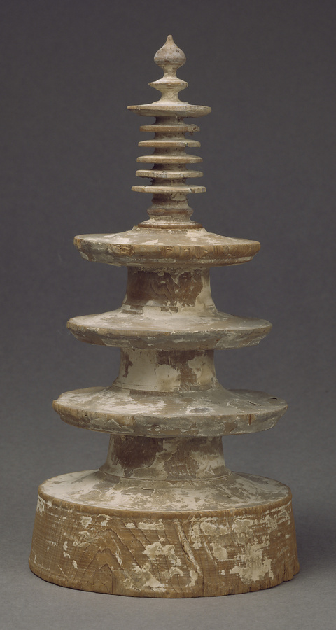 ロクロを使い木材を回転して削り出した小塔。表面は白色塗装である。奈良時代後半、天平宝字八年(764)に起きた藤原仲麻呂の乱ののち、孝謙上皇の発願によって鎮護国家を祈念して作られた。このような小塔が全部で