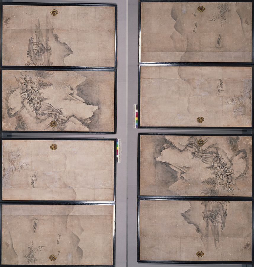 旧養徳院方丈を飾った障壁画のうち、最古の部分は延徳二年(一四九〇)頃のものだが、絵はその後、改造や加筆が何度もなされた。本作は、江戸時代には「山水図小襖」などとともに室中を飾っていた襖である。宗継が描いた「山水図襖」などとは作風が異なり、十八世紀には周文筆と言い伝えられていた。後世に大幅な加筆が加えられており、中世のものか、後に追加されたものか、制作時期の正確な判断が難しい。基本的な構図やモチーフは室町時代の水墨画のスタイルをふまえており、何かしら原画の情報を留めている可能性もある。
