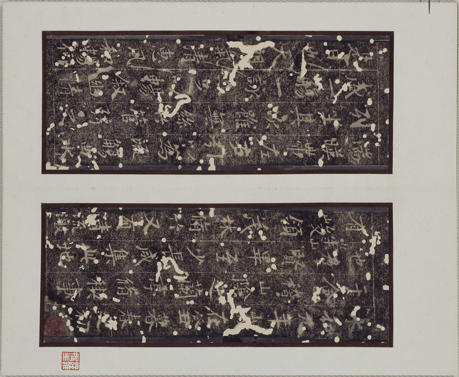 国学本とは、明時代の万暦年間(一五七三~一六二〇)に出土し、のちに国学に置かれた王羲之の名文「蘭亭序」の臨書碑の拓本を指す。初唐の三大家にして楷書で知られた欧陽詢(五五七~六四一)のものを石刻した定武本の系統に属する。本帖は、比較的その字すがたをよく留めた拓本である。羅振玉の旧蔵品で、帙の題箋は内藤湖南による。