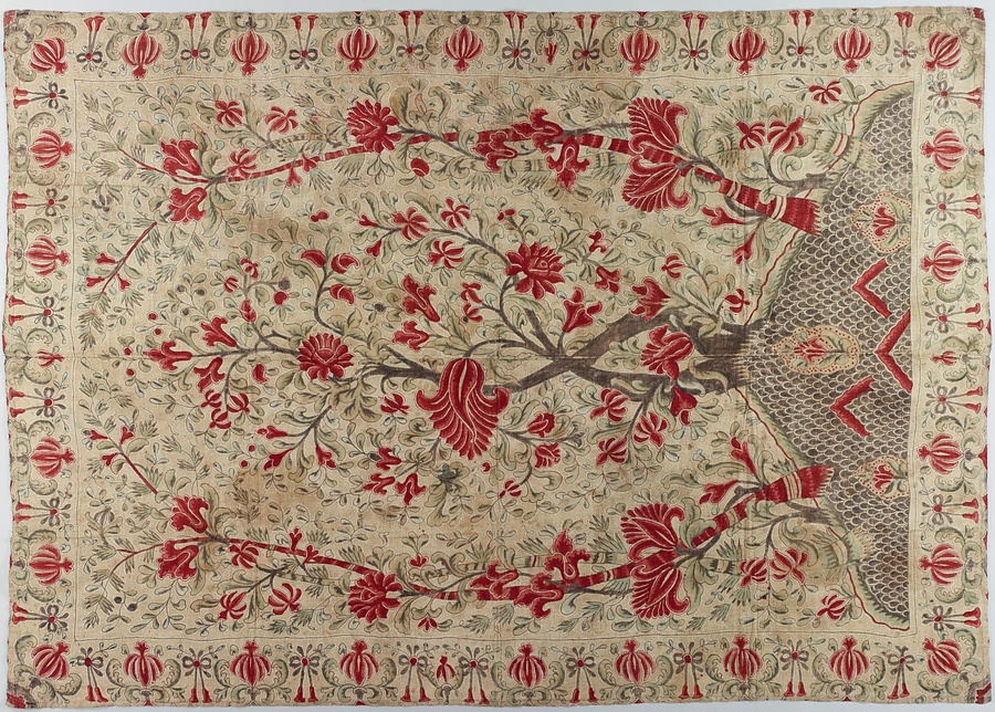手描き更紗(カラム・カリ)の産地、南インドで、壁掛け用に製作された更紗。華やかな大判の立木文様は、本来、ヨーロッパで好まれた文様ですが、この更紗はインドネシアで発見され、壁掛けとして使用されていました。輸出用更紗の広がりを伝えるものです。