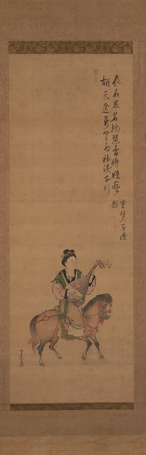 守景は狩野探幽の高弟。王昭君は前漢元帝の後宮随一の美女。匈奴(きょうど)の単于(ぜんう)に美女を求められ、画工への賄賂(わいろ)を拒否したために醜く描かれた画像で王昭君を選んだ元帝は、別れ際に初めて彼女の美しさを見て後悔した。胡地(こち)に赴(おもむ)く馬上で琵琶を弾く姿に描かれる。(2006/07/04_h082)
