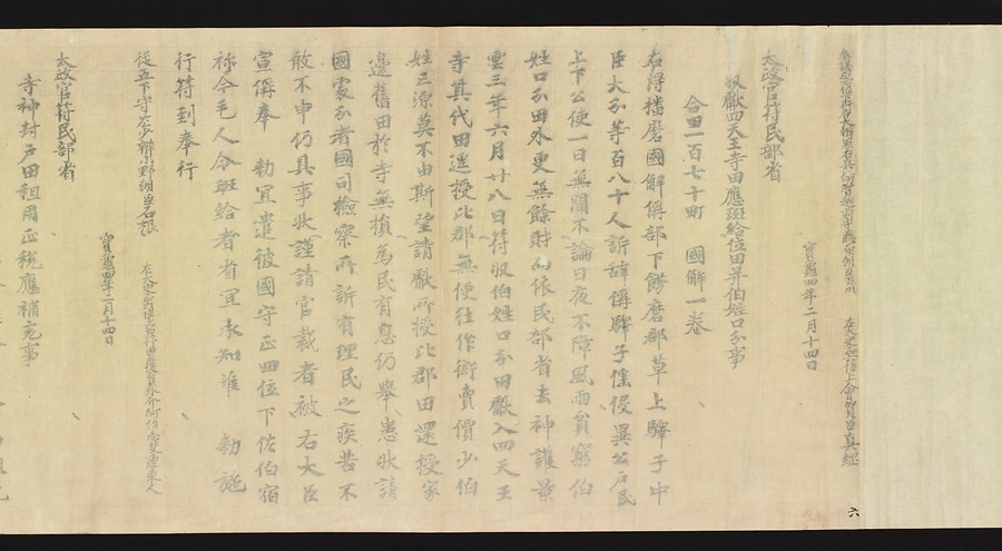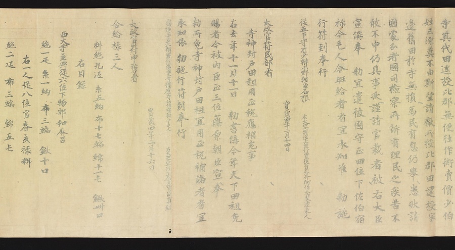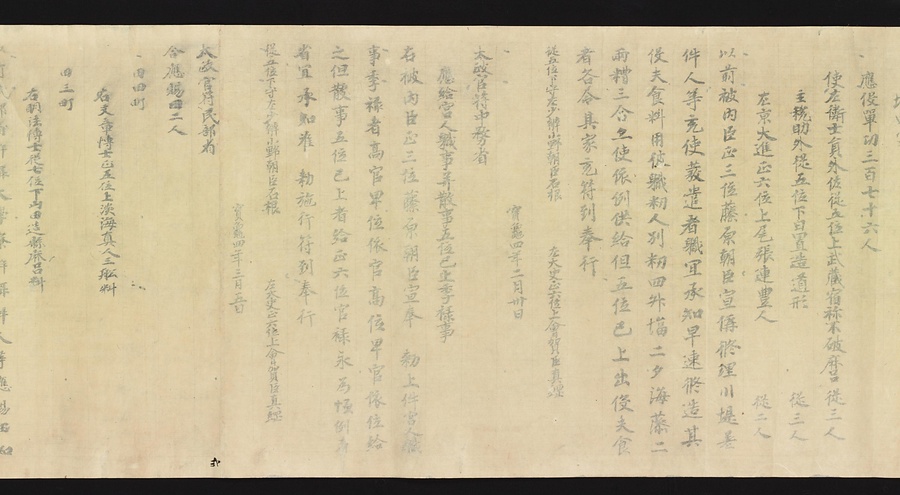 日本では7世紀の後半に、中国の例を学んだ法律が取り入れられました。それを律令(りつりょう)といいます。律は犯罪を罰する刑法、令はそれ以外の法律を指す言葉です。しかし、中国にならった律令は、日本の実情に合わない部分も多く、それを補うために出された法律を格(きゃく)といいます。そして、この律・令・格を実際に運用するうえで必要になる細かな規則を式と呼びます。平安時代において、この式は社会の変化に合わせてたびたび改められ、補われました。その中でも、延喜5 (905) 年に、醍醐(だいご)天皇の命令によって編集を開始したのが延喜式です。これ以前の式は一部しか残っていませんが、延喜式はほぼ完全な形で伝えられている点で重要な史料です。