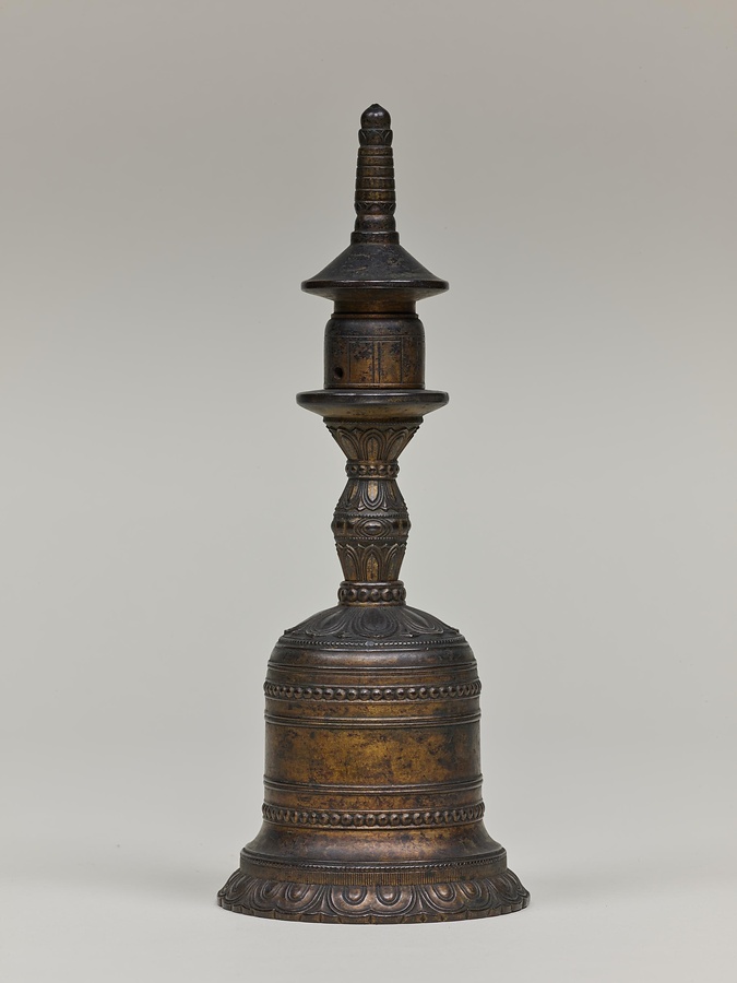 こうしたベルの中に、握り手の先端を仏塔の形につくったものがあります。ここにご紹介するのもその一例です。銅を鋳造して形をつくり、表面を鍍金しています。塔の身から上は取り外しができるようになっており、中は空洞です。あるいは中に「仏舎利」(ぶっしゃり)を入れていたのかもしれません。ベルの口縁には銘文が刻まれており、その中に1306年の年記があります。肉厚で重厚な作風は、14世紀初期という時代性をよく示しています。