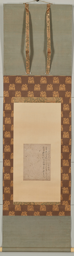 金銀の揉み箔を散らした料紙に『後撰和歌集』巻5秋上巻末の和歌一首を書写しています。もとは粘葉装の冊子本でした。「本願寺本三十六人家集」(国宝、西本願寺所蔵)の「元貞集」と同筆で、当時活躍した能書による仮名と左側に広がる余白が見どころです。ルビ:も(み)はく、りょうし、でっちょうそう、ほんがんじぼんさんじゅうろくにんかしゅう、のうしょ、かな、
