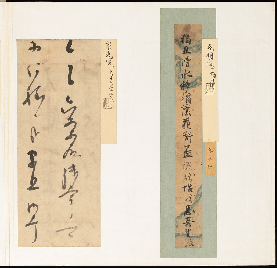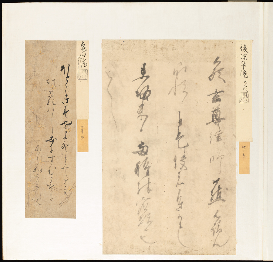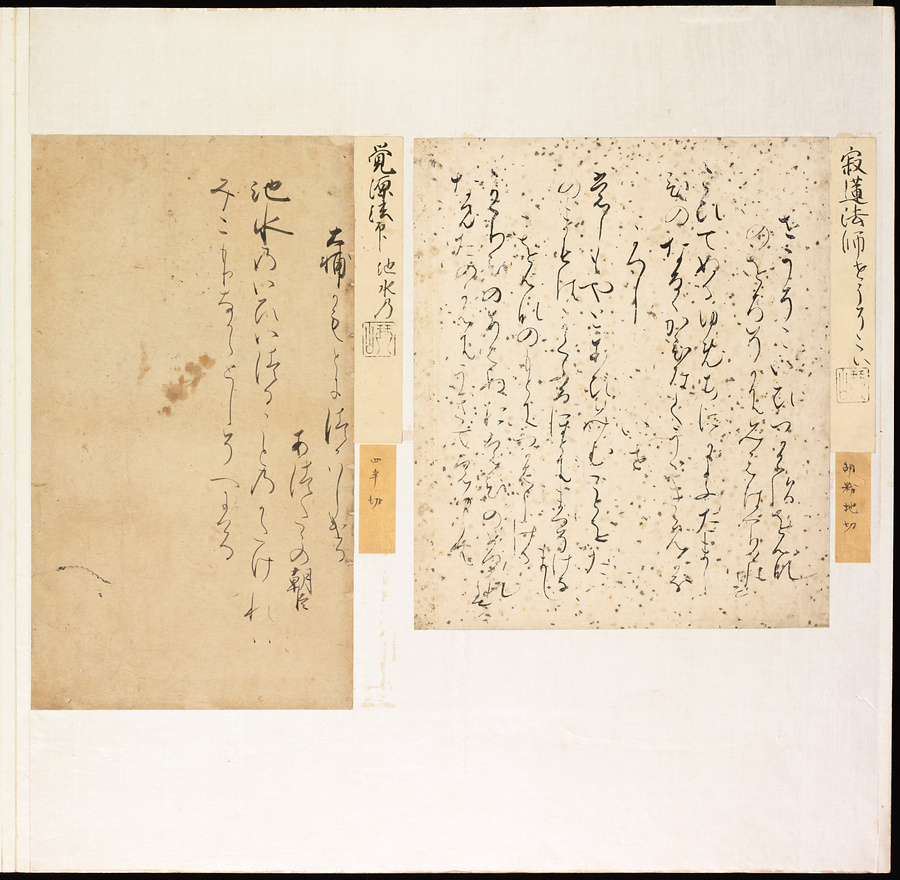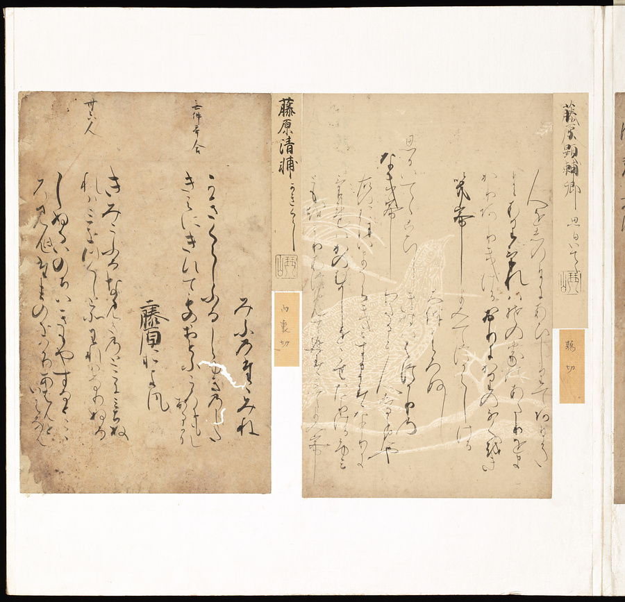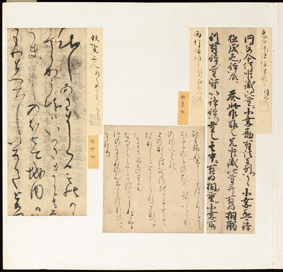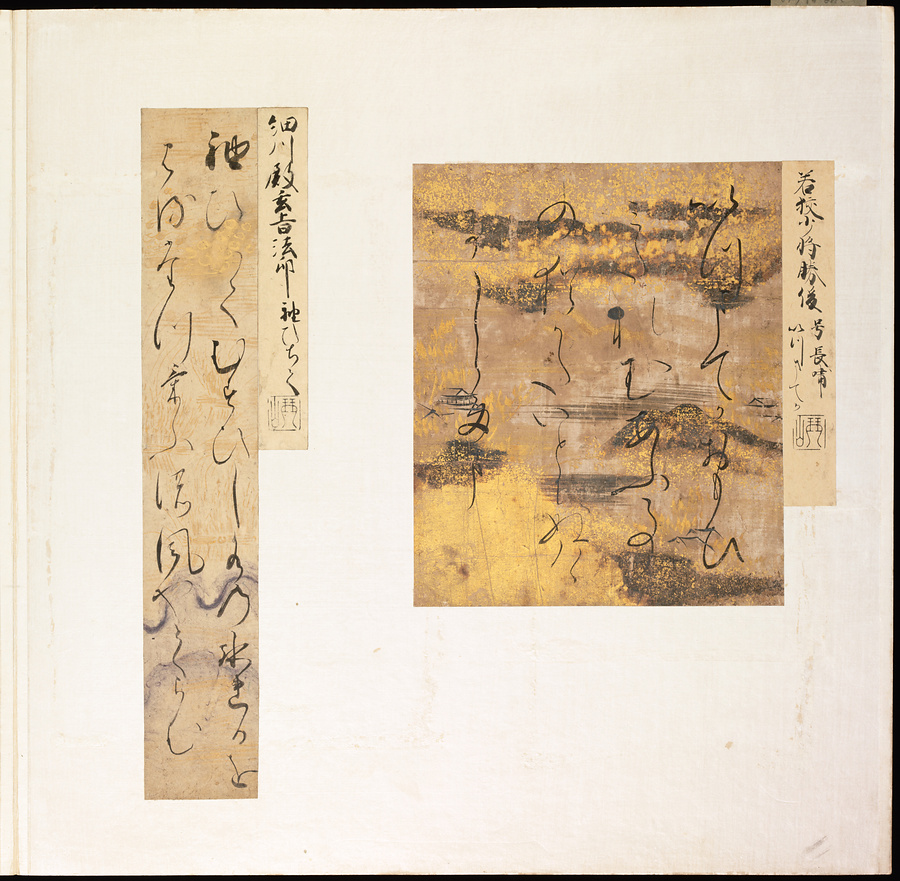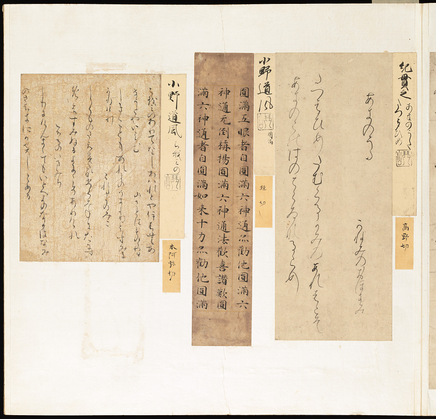 手鑑は折本の形式で作られることが多く、表面の最初に「大聖武」(おおじょうむ)とよばれる聖武天皇(しょうむてんのう)の筆跡、それに続いて、天皇、親王、公卿の筆跡を、裏面は聖徳太子(しょうとくたいし)からはじまって、高僧、歌人、武家の筆跡を貼るなどの決まりがありました。それぞれの筆跡の右横には、誰の筆跡かを記した極札(きわめふだ)が貼られています。これは、筆跡の鑑定をする専門家が記したものです。この作品は、そうした決まりごとに忠実に、さまざまな筆跡を集めていること、また、「高野切」(こうやぎれ)「本阿弥切」(ほんあみぎれ)「綾地切」(あやじぎれ)「兼輔集切」(かねすけしゅうぎれ)などの名品を多く含むことから、たいへん貴重な手鑑です。
