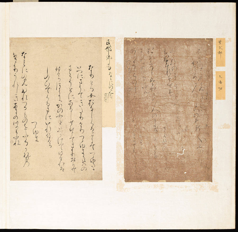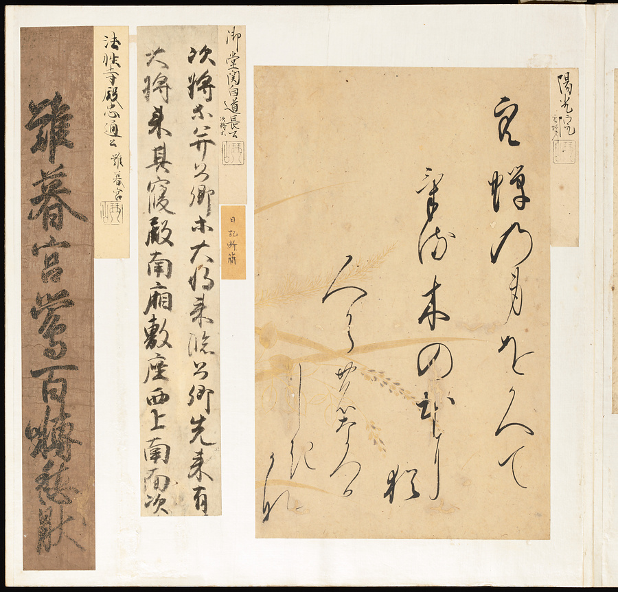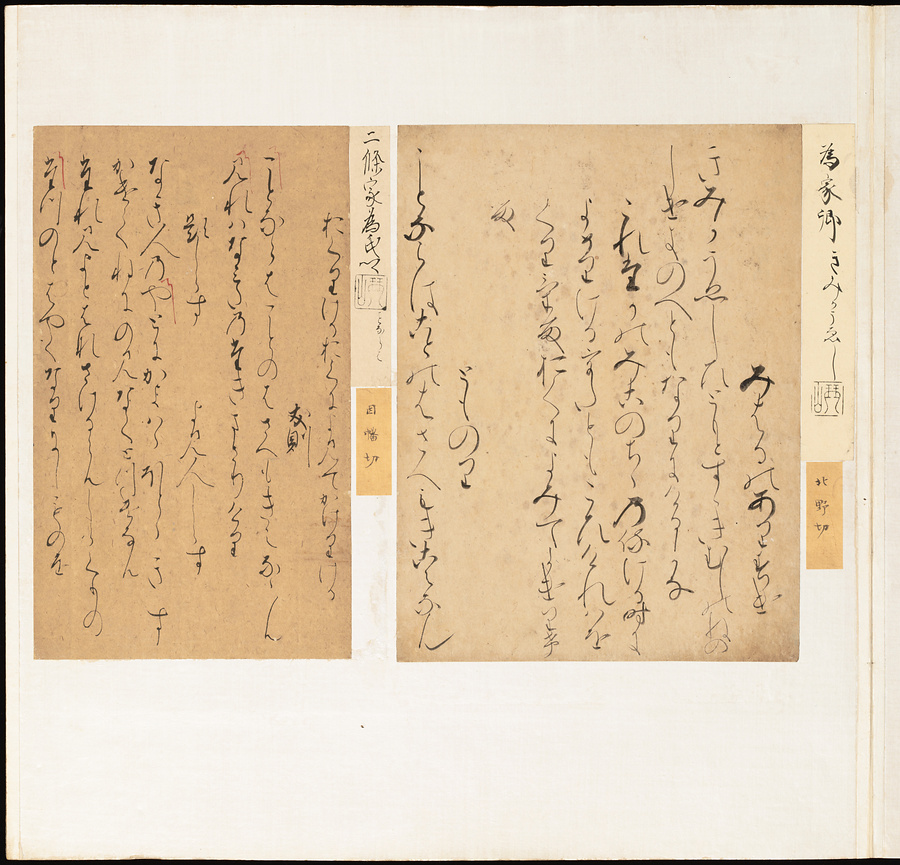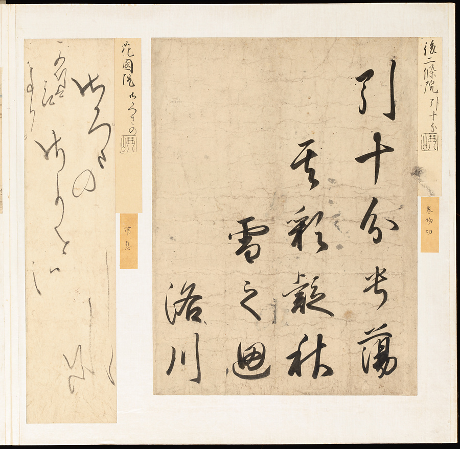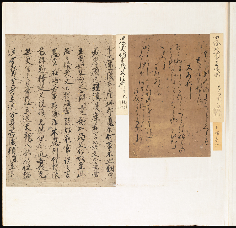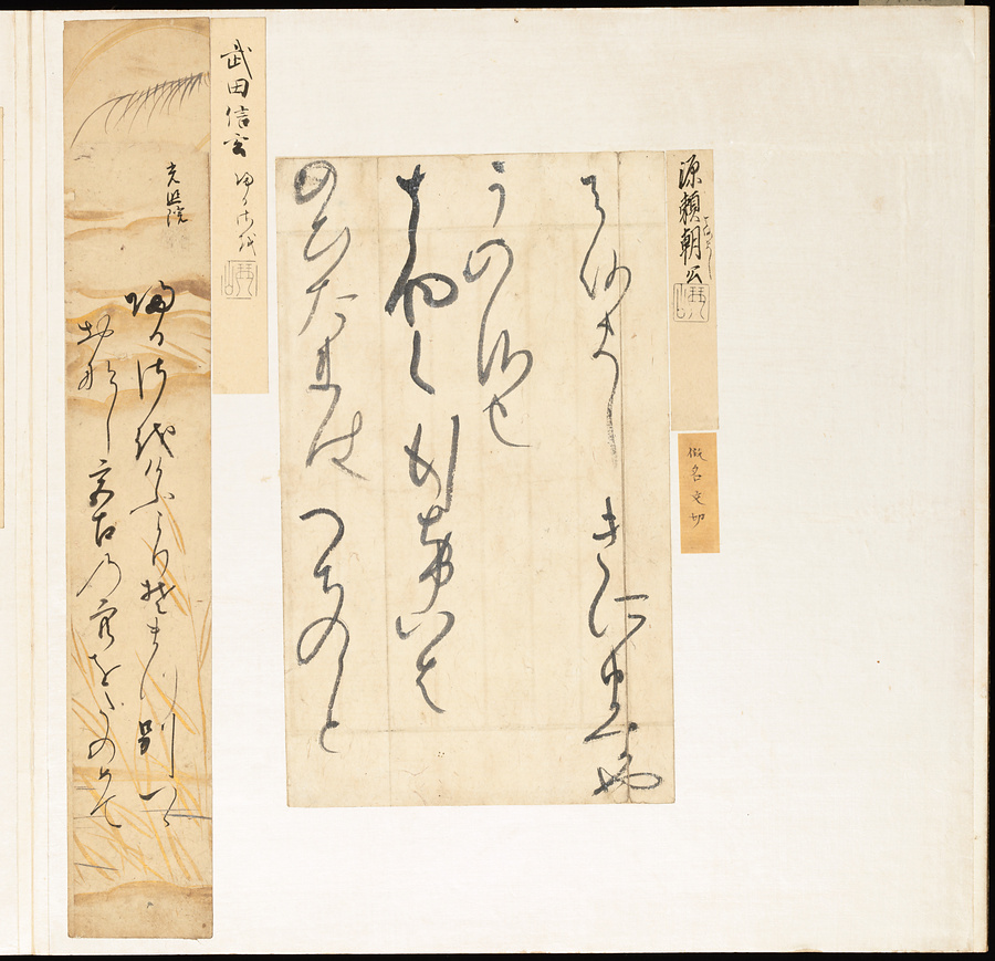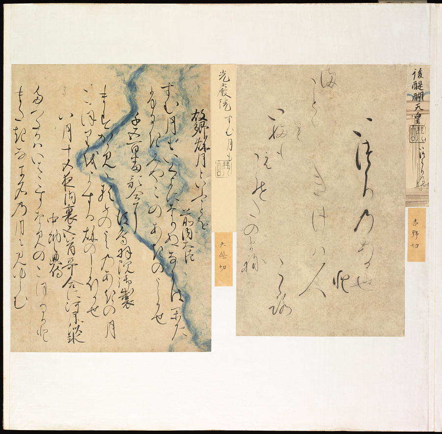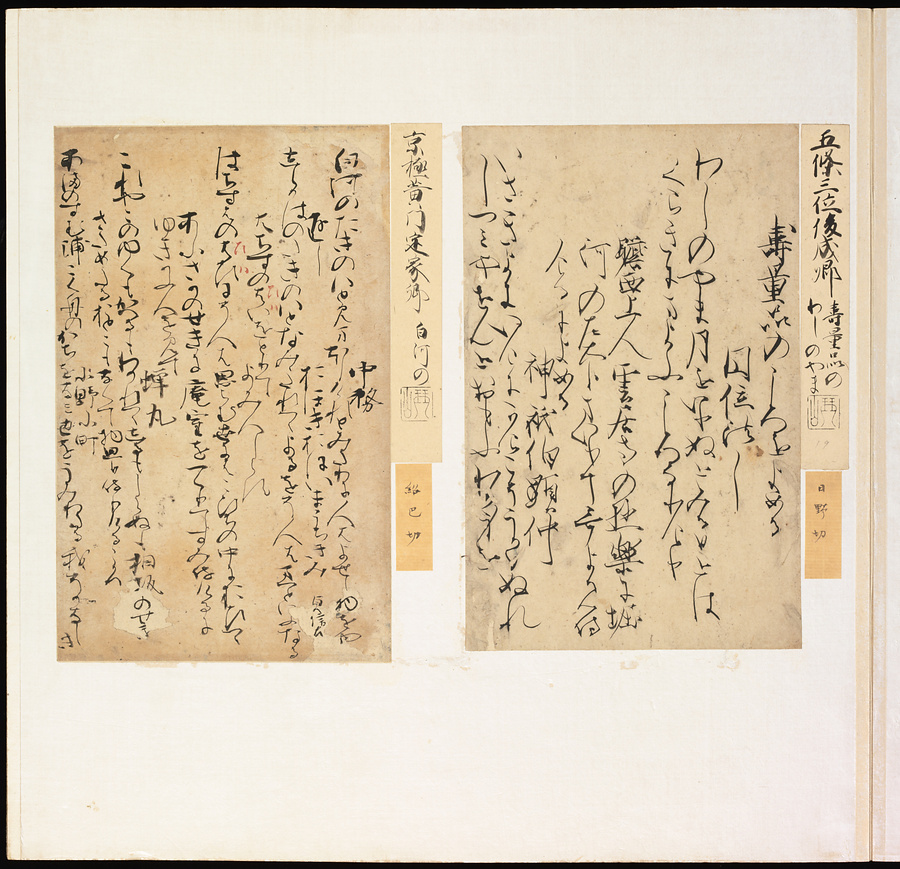 手鑑は折本の形式で作られることが多く、表面の最初に「大聖武」(おおじょうむ)とよばれる聖武天皇(しょうむてんのう)の筆跡、それに続いて、天皇、親王、公卿の筆跡を、裏面は聖徳太子(しょうとくたいし)からはじまって、高僧、歌人、武家の筆跡を貼るなどの決まりがありました。それぞれの筆跡の右横には、誰の筆跡かを記した極札(きわめふだ)が貼られています。これは、筆跡の鑑定をする専門家が記したものです。この作品は、そうした決まりごとに忠実に、さまざまな筆跡を集めていること、また、「高野切」(こうやぎれ)「本阿弥切」(ほんあみぎれ)「綾地切」(あやじぎれ)「兼輔集切」(かねすけしゅうぎれ)などの名品を多く含むことから、たいへん貴重な手鑑です。
