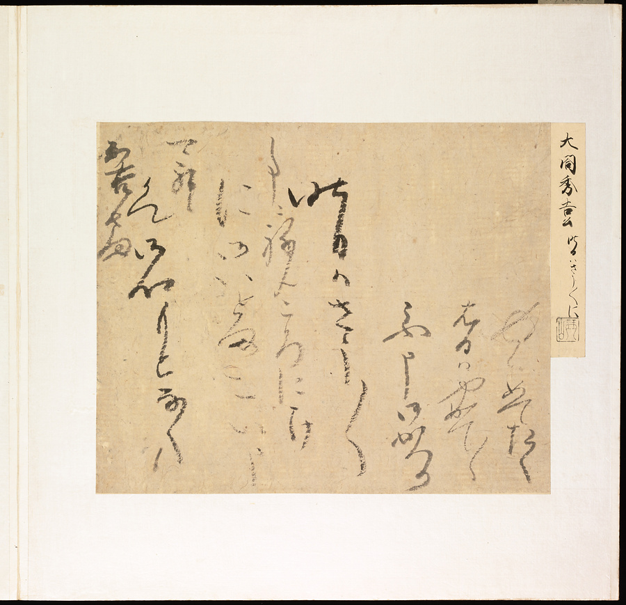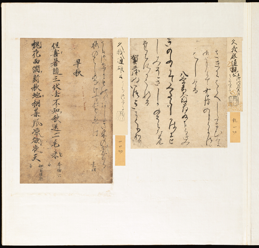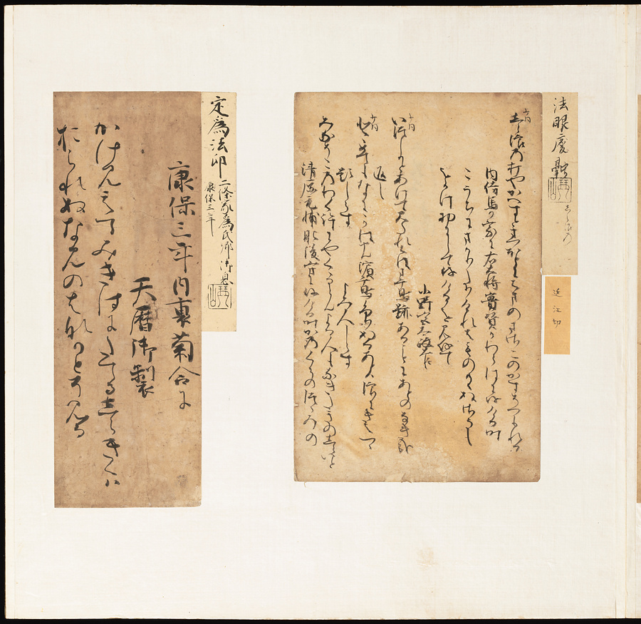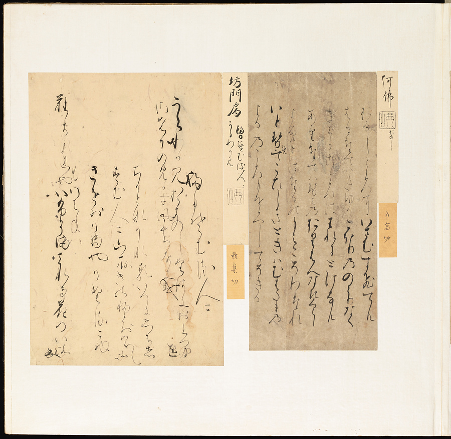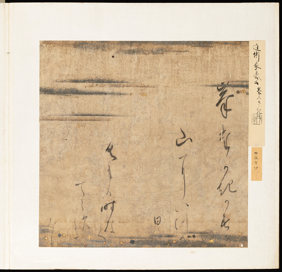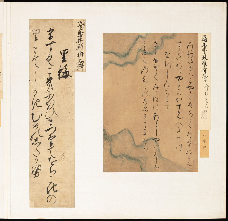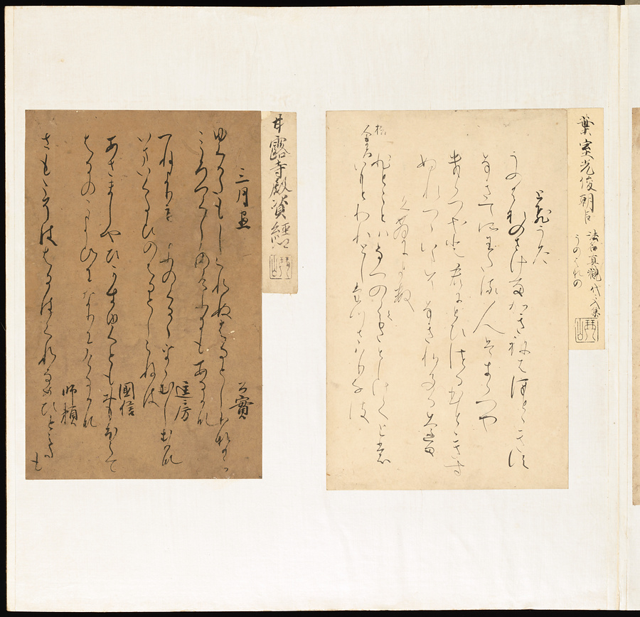 手鑑は折本の形式で作られることが多く、表面の最初に「大聖武」(おおじょうむ)とよばれる聖武天皇(しょうむてんのう)の筆跡、それに続いて、天皇、親王、公卿の筆跡を、裏面は聖徳太子(しょうとくたいし)からはじまって、高僧、歌人、武家の筆跡を貼るなどの決まりがありました。それぞれの筆跡の右横には、誰の筆跡かを記した極札(きわめふだ)が貼られています。これは、筆跡の鑑定をする専門家が記したものです。この作品は、そうした決まりごとに忠実に、さまざまな筆跡を集めていること、また、「高野切」(こうやぎれ)「本阿弥切」(ほんあみぎれ)「綾地切」(あやじぎれ)「兼輔集切」(かねすけしゅうぎれ)などの名品を多く含むことから、たいへん貴重な手鑑です。