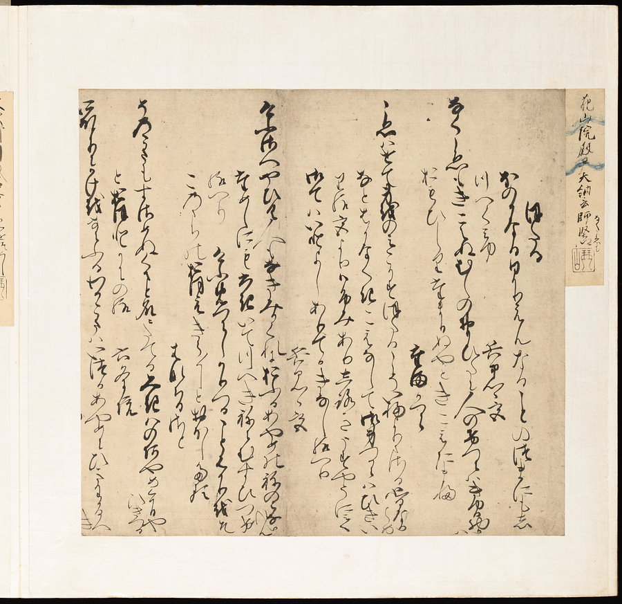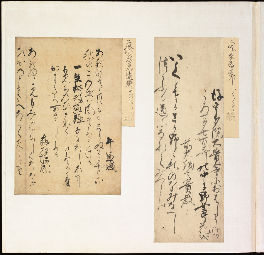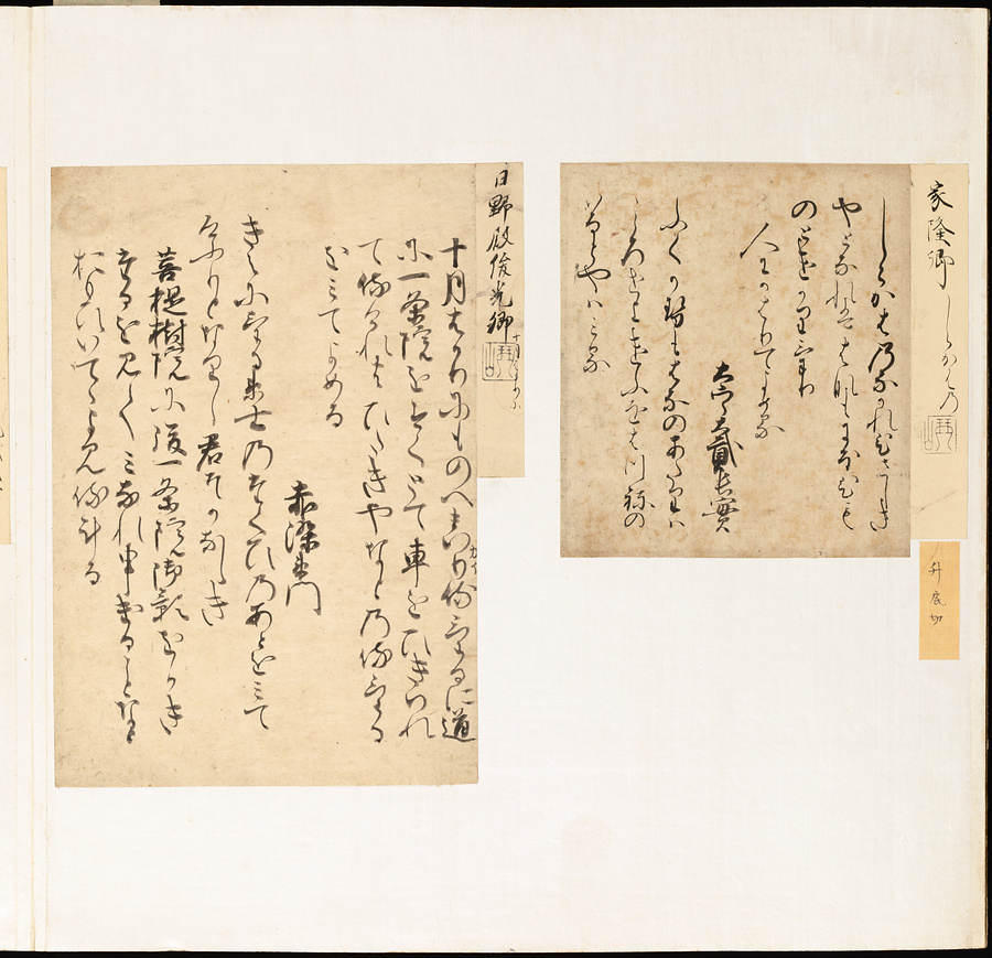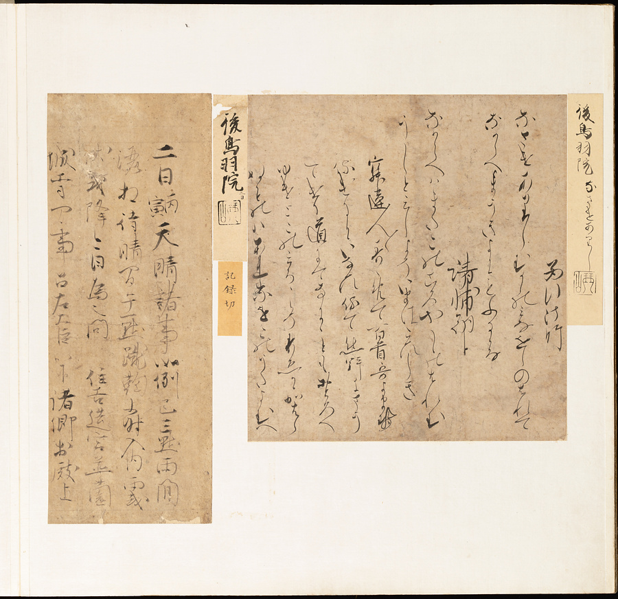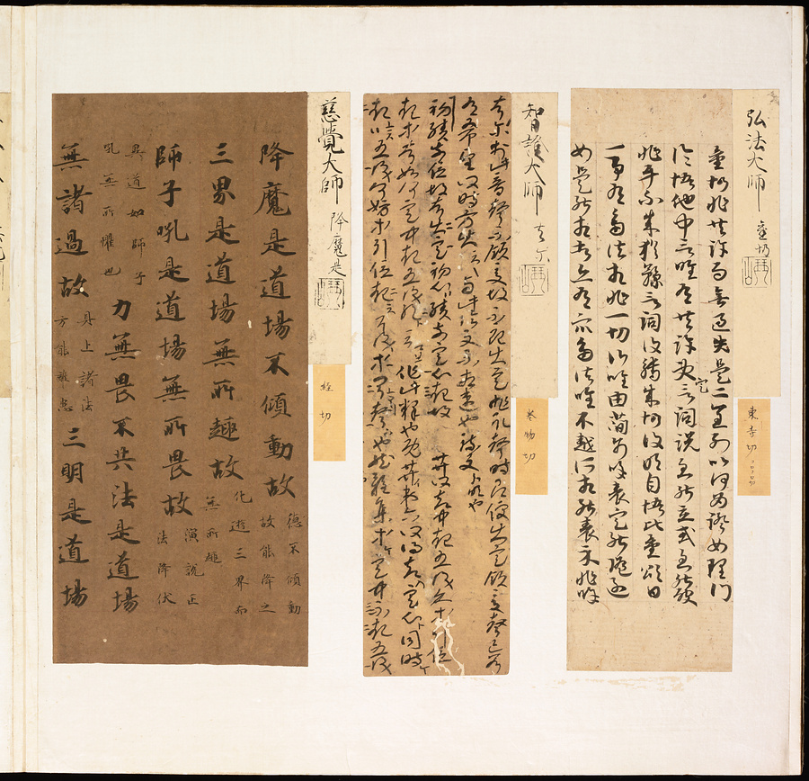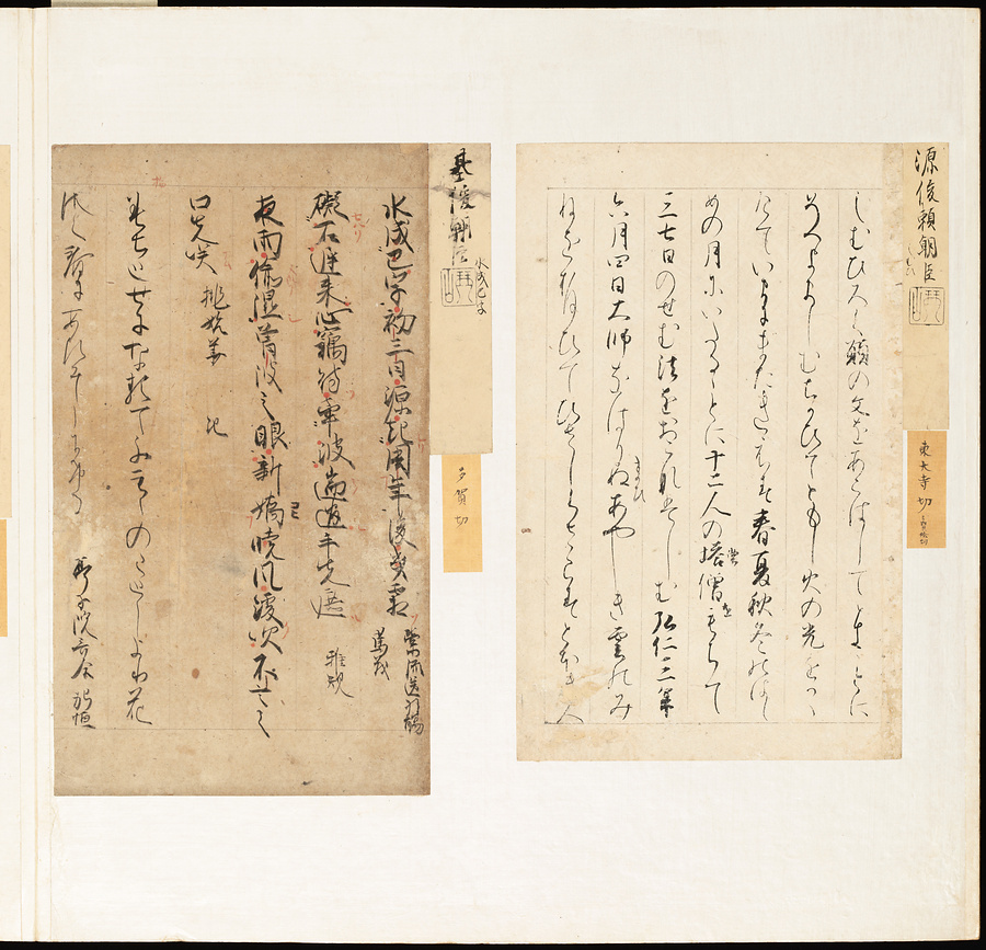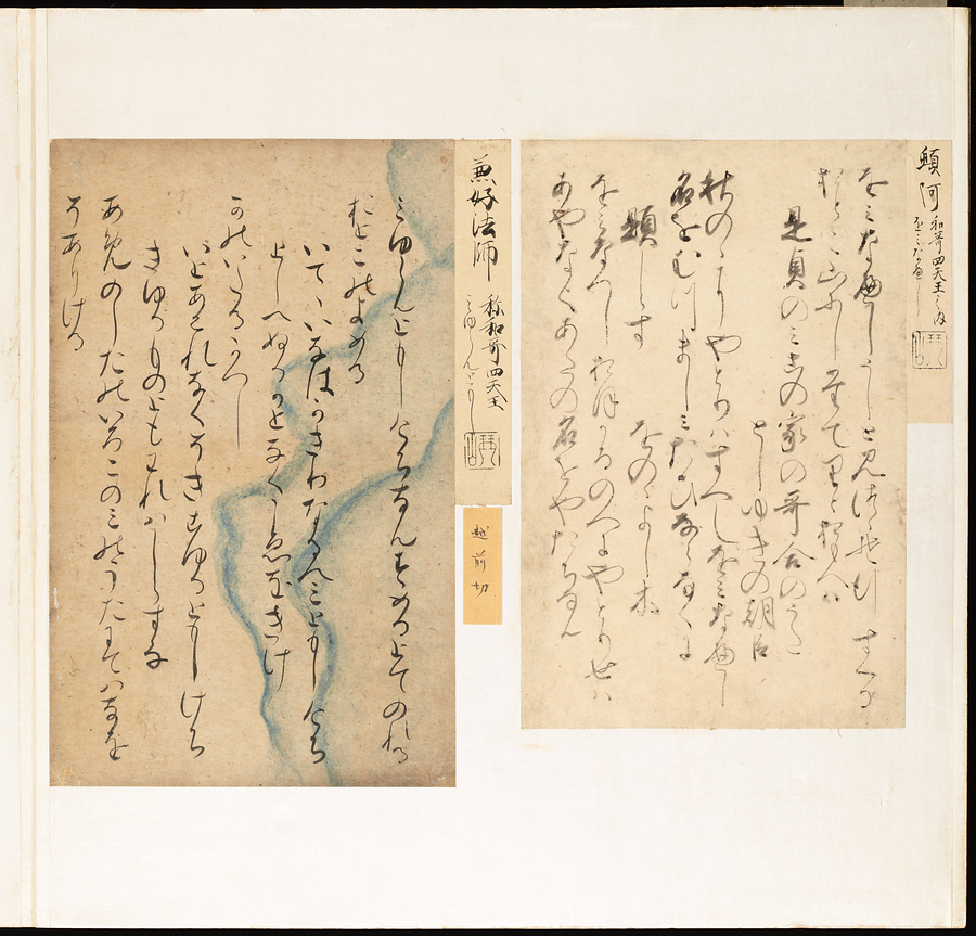 手鑑は折本の形式で作られることが多く、表面の最初に「大聖武」(おおじょうむ)とよばれる聖武天皇(しょうむてんのう)の筆跡、それに続いて、天皇、親王、公卿の筆跡を、裏面は聖徳太子(しょうとくたいし)からはじまって、高僧、歌人、武家の筆跡を貼るなどの決まりがありました。それぞれの筆跡の右横には、誰の筆跡かを記した極札(きわめふだ)が貼られています。これは、筆跡の鑑定をする専門家が記したものです。この作品は、そうした決まりごとに忠実に、さまざまな筆跡を集めていること、また、「高野切」(こうやぎれ)「本阿弥切」(ほんあみぎれ)「綾地切」(あやじぎれ)「兼輔集切」(かねすけしゅうぎれ)などの名品を多く含むことから、たいへん貴重な手鑑です。