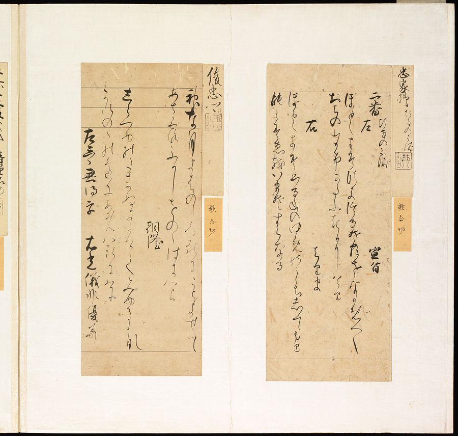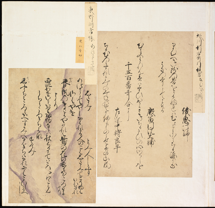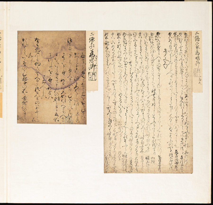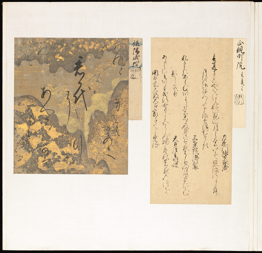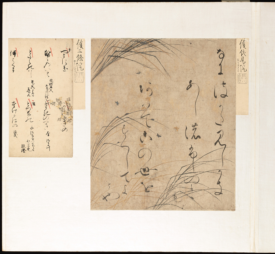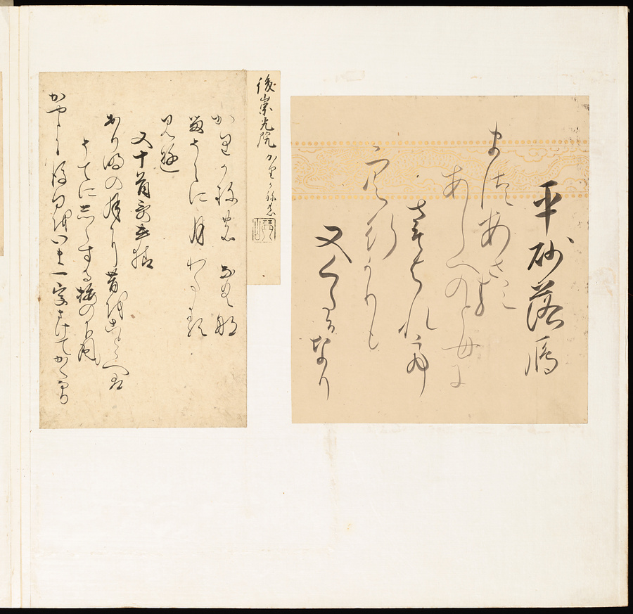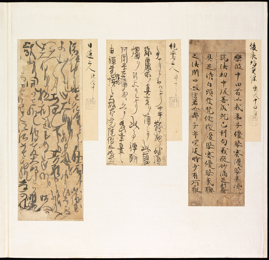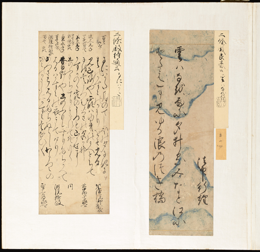 手鑑は折本の形式で作られることが多く、表面の最初に「大聖武」(おおじょうむ)とよばれる聖武天皇(しょうむてんのう)の筆跡、それに続いて、天皇、親王、公卿の筆跡を、裏面は聖徳太子(しょうとくたいし)からはじまって、高僧、歌人、武家の筆跡を貼るなどの決まりがありました。それぞれの筆跡の右横には、誰の筆跡かを記した極札(きわめふだ)が貼られています。これは、筆跡の鑑定をする専門家が記したものです。この作品は、そうした決まりごとに忠実に、さまざまな筆跡を集めていること、また、「高野切」(こうやぎれ)「本阿弥切」(ほんあみぎれ)「綾地切」(あやじぎれ)「兼輔集切」(かねすけしゅうぎれ)などの名品を多く含むことから、たいへん貴重な手鑑です。