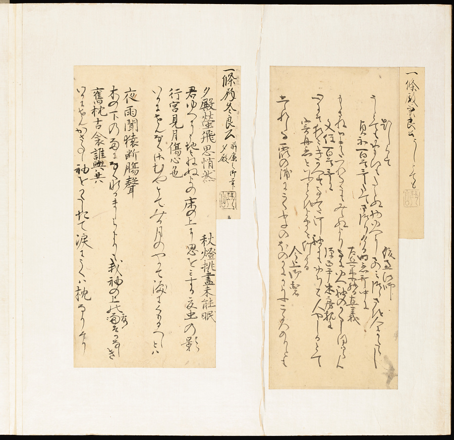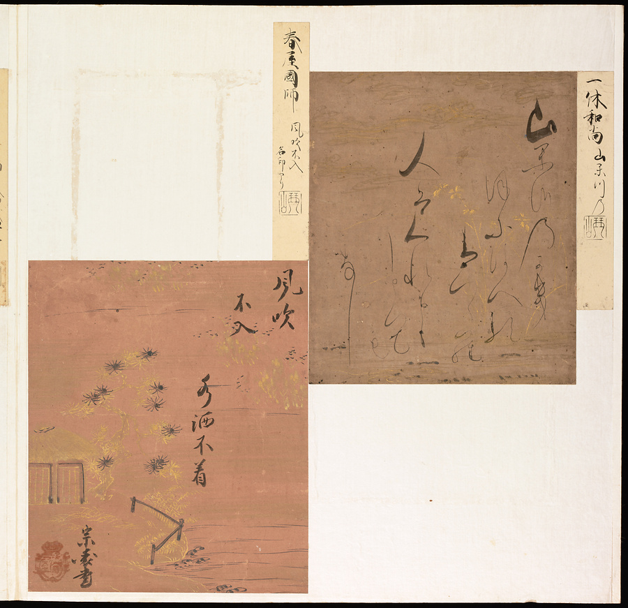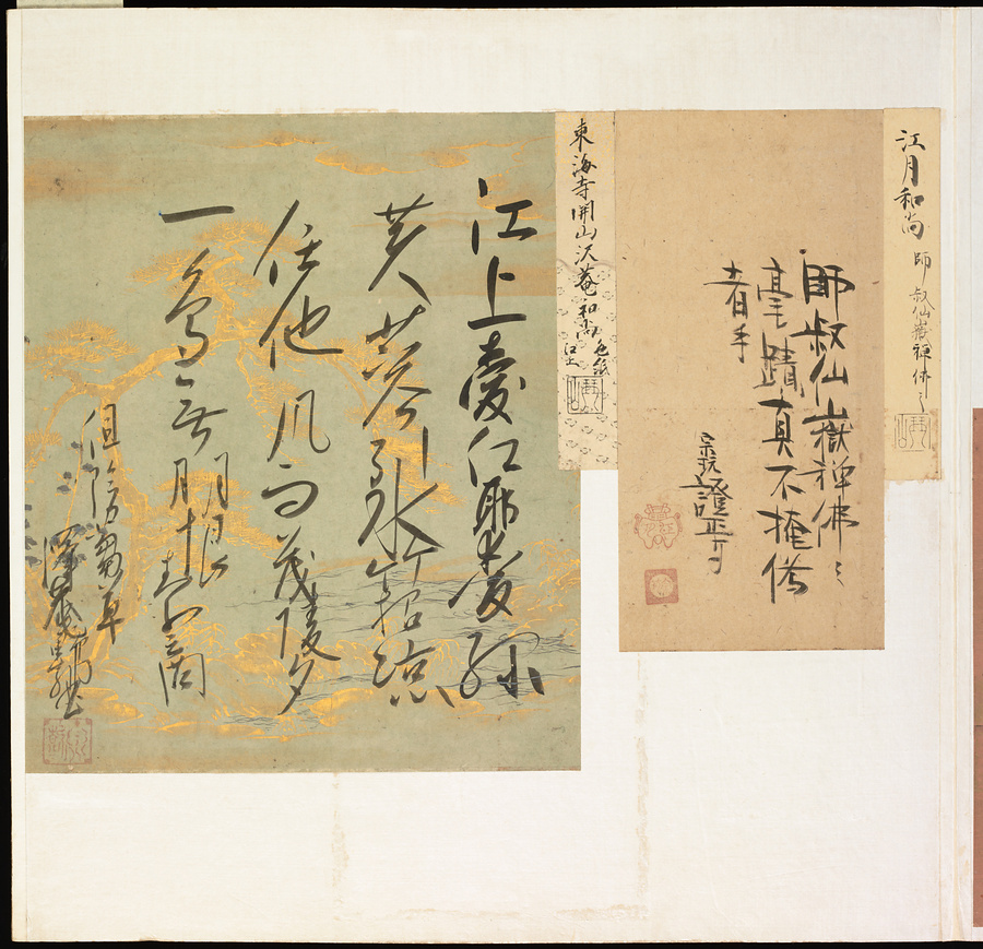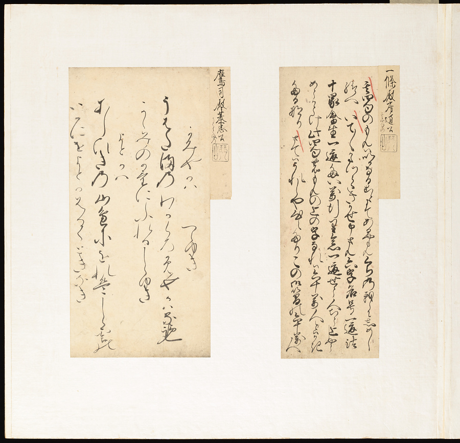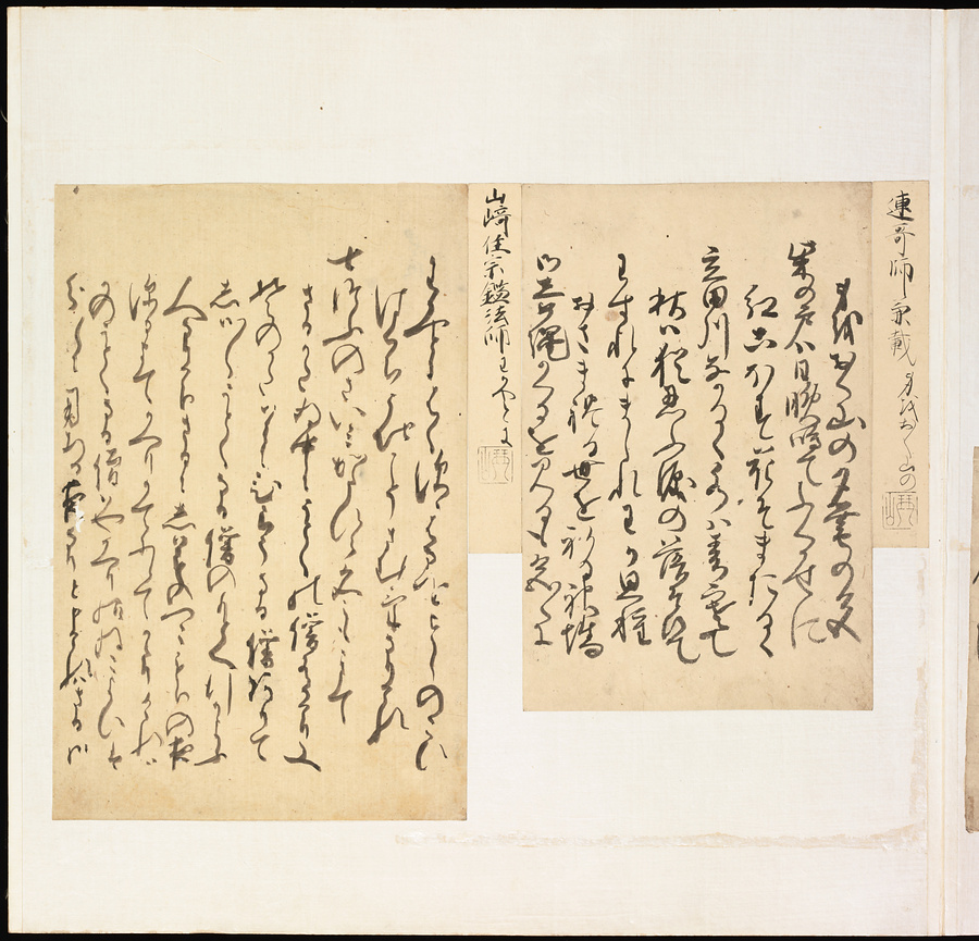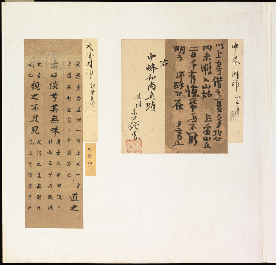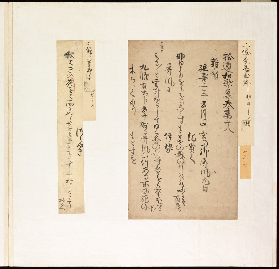 手鑑は折本の形式で作られることが多く、表面の最初に「大聖武」(おおじょうむ)とよばれる聖武天皇(しょうむてんのう)の筆跡、それに続いて、天皇、親王、公卿の筆跡を、裏面は聖徳太子(しょうとくたいし)からはじまって、高僧、歌人、武家の筆跡を貼るなどの決まりがありました。それぞれの筆跡の右横には、誰の筆跡かを記した極札(きわめふだ)が貼られています。これは、筆跡の鑑定をする専門家が記したものです。この作品は、そうした決まりごとに忠実に、さまざまな筆跡を集めていること、また、「高野切」(こうやぎれ)「本阿弥切」(ほんあみぎれ)「綾地切」(あやじぎれ)「兼輔集切」(かねすけしゅうぎれ)などの名品を多く含むことから、たいへん貴重な手鑑です。