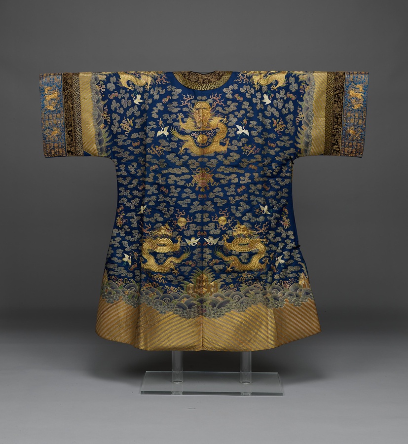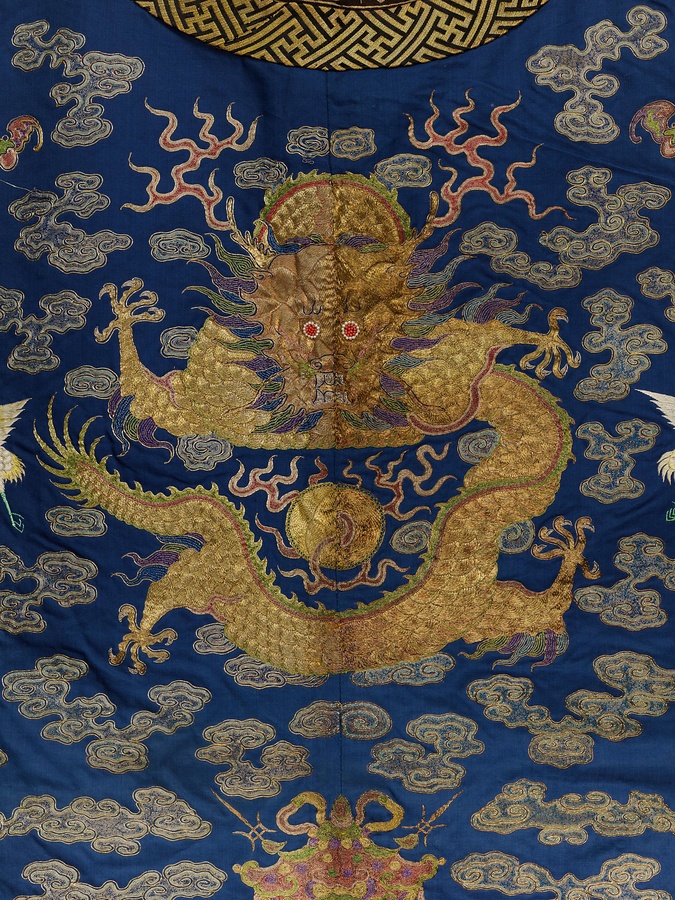 京劇など、清朝の皇帝役の舞台衣装と考えられます。金銀糸を用いた、重厚な刺繡【ししゅう】が施されています。七色に光輝くように見えるのは、色とりどりの糸で金銀糸を留めつけているためです。龍や蝶、牡丹、蝙蝠【こうもり】、鶴、桃などのモチーフは、中国における代表的な吉祥【きっしょう】文様です。