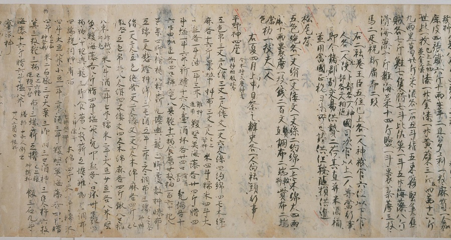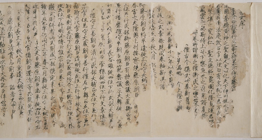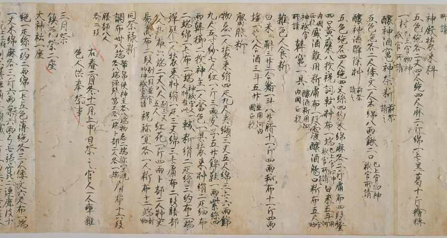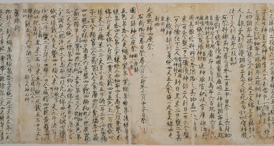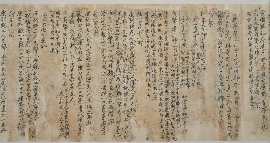 日本では7世紀の後半に、中国の例を学んだ法律が取り入れられました。それを律令(りつりょう)といいます。律は犯罪を罰する刑法、令はそれ以外の法律を指す言葉です。しかし、中国にならった律令は、日本の実情に合わない部分も多く、それを補うために出された法律を格(きゃく)といいます。そして、この律・令・格を実際に運用するうえで必要になる細かな規則を式と呼びます。平安時代において、この式は社会の変化に合わせてたびたび改められ、補われました。その中でも、延喜5 (905) 年に、醍醐(だいご)天皇の命令によって編集を開始したのが延喜式です。これ以前の式は一部しか残っていませんが、延喜式はほぼ完全な形で伝えられている点で重要な史料です。