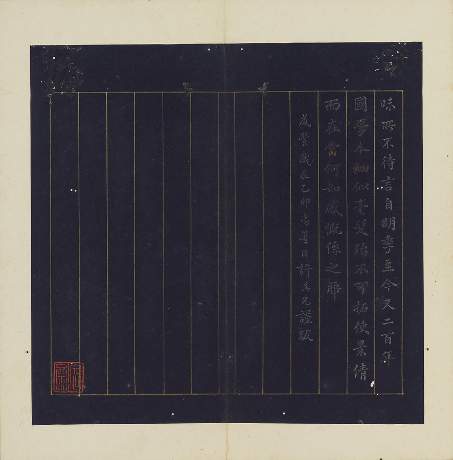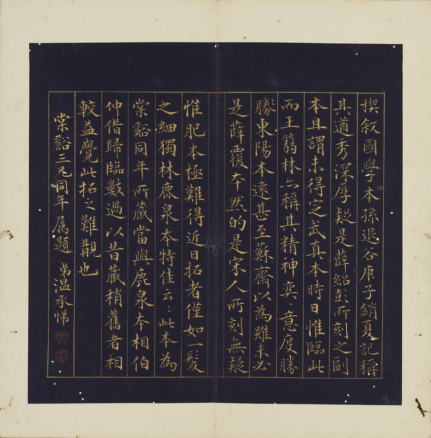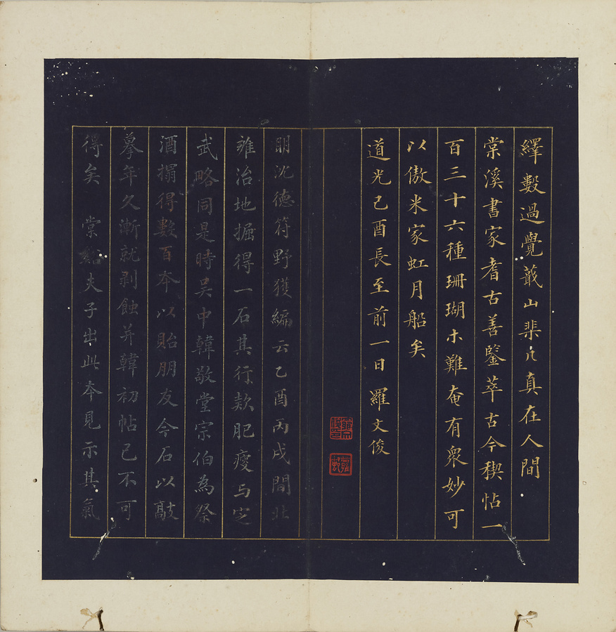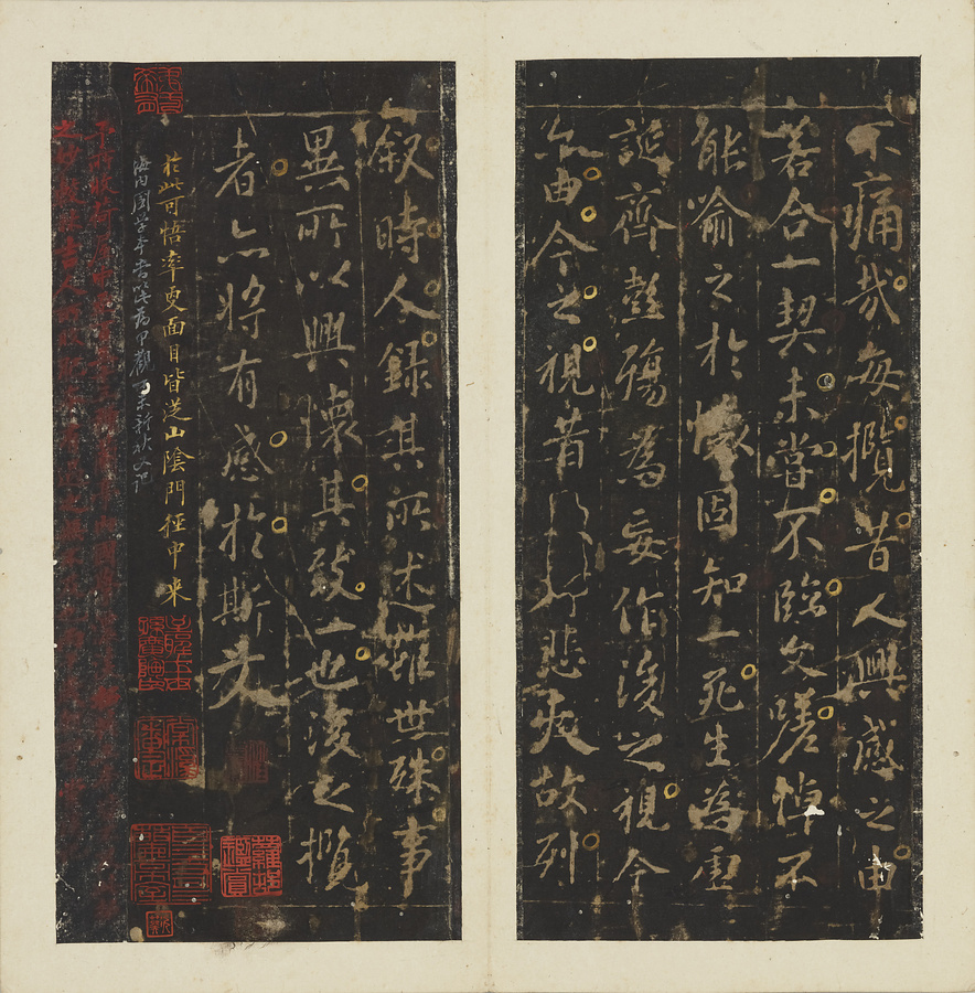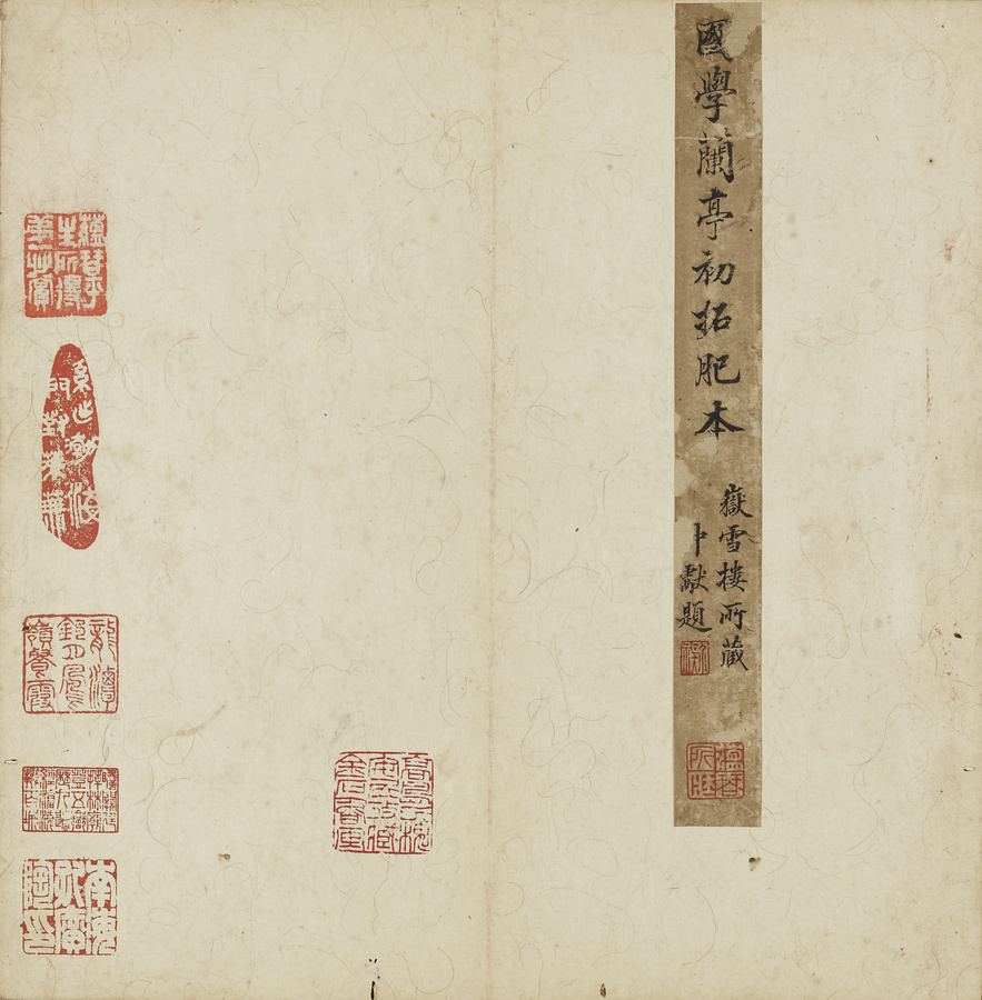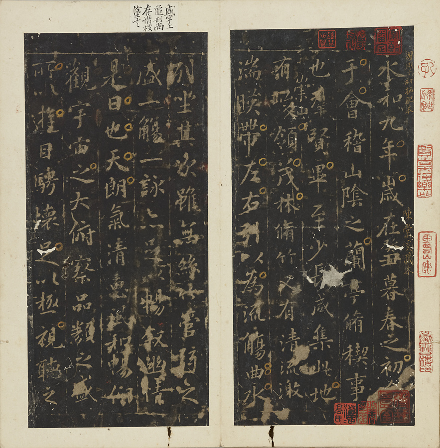 明の万暦@ばんれき@年間(1573~1620)に天師庵@てんしあん@から出土した定武本@ていぶぼん@系統の蘭亭序@らんていじょ@の帖石は、国学(国立大学)に保存されたことから、その拓本は国学本蘭亭序と称されます。帖石の損傷により不鮮明な箇所が散見されますが、伝存する作例は少なく貴重です。清末の広東@カントン@の収蔵家、孔広陶@こうこうとう@の旧蔵品。