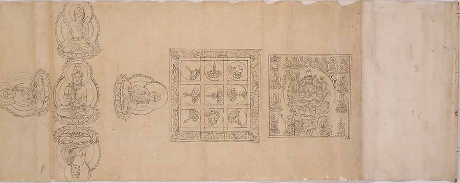 何が描かれているか完全には解明されていない珍しい図像集で、類本が京都・仁和寺蔵密教図像の中にある。特に、第三番目の金剛界五仏は、京都・安祥寺蔵金剛界五仏坐像(当館寄託)と一致する珍しい図像として知られており、安祥寺を開いた恵運(七九八~八六九)との関係が指摘されている。全体に油を引いて敷き写したことがよくわかり、十三世紀に遡るものと考えられる。