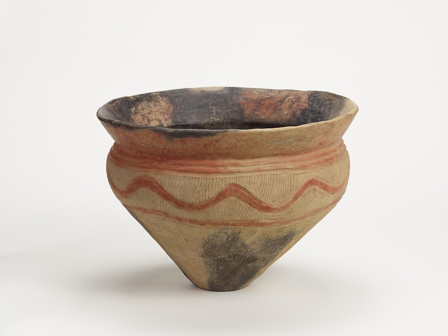 縄文時代中期の東関東地方を中心に分布する土器。口縁部と胴部の平行・蛇行沈線間の赤彩が特徴的である。この時期の日本列島では、新潟の火焔型土器をはじめとする口縁部が過剰に装飾された土器が各地で流行した。赤彩がなされた本品は、その地域性や表現手法の多様性を知る上で貴重である。