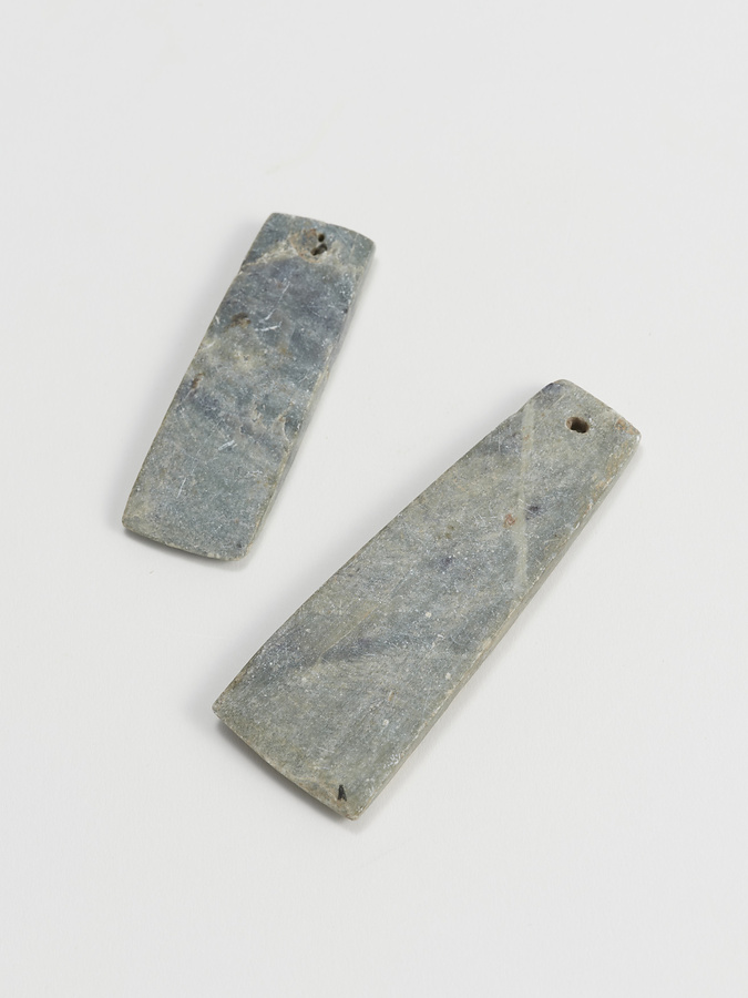 横斧に用いられた板状鉄斧が古墳時代に大型化したものが短冊状鉄斧で、本品はこれを滑石で模造したものである。2点あり大小の別がある。大型品は灰緑色で白色の斑がある。穿孔に1度失敗し、再度隣接して穿たれている。小型品は大型品と同工だが、多孔質で不整形な孔になっている。刃先は削ってていねいに仕上げる。本品は5世紀初頭に製作され、同一古墳から出土した可能性がある。石製模造品の品目には大小のペアとなる相似形態を持つものがあり、石製祭器の特徴が良く出ている。