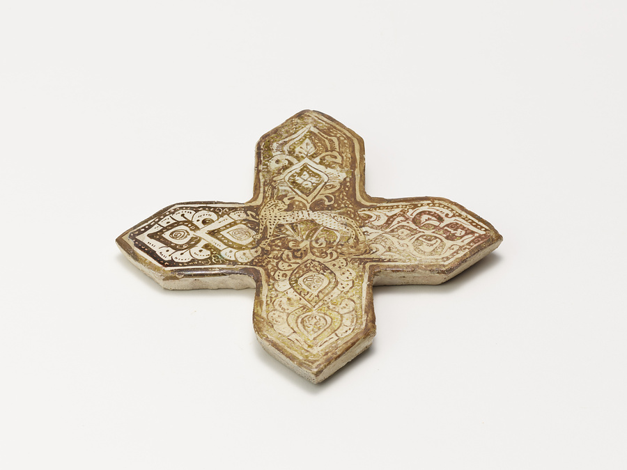陶器のラスター彩のタイル。型で成形した三角形の頂点を持つ十字型をしている。十字の中央には、立ち止まって後を振り返る様子の動物の姿が横向きにあらわされている。身体には斑点があり、長い尻尾と長い耳が見られる。この部分は後補による復元が重なるため、当初の姿は不明である。動物の足下には植物が生えており、残る空間も植物文で埋め尽くされている。本作品のような、十字型タイルは、八稜星形タイルを壁に貼り付けた際にできる隙間を埋めるために用いられ、宮殿や個人住宅の壁面を飾るために大量に作られた。白釉で全面を覆って高火度焼成後、銅の酸化物を含む絵具を用い、白地を活かしながら動物や植物文を描き、再度低火度還元焼成することで、金属の光沢を獲得した。