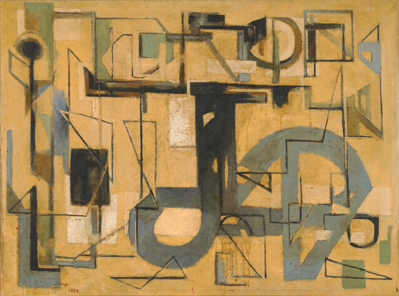 この作品は直線と曲線とを大胆に組み合わせた幾何学的な抽象表現であり、厚塗りの絵具の痕跡が生々しく残されたこの年代の髙階の代表的な作品である。