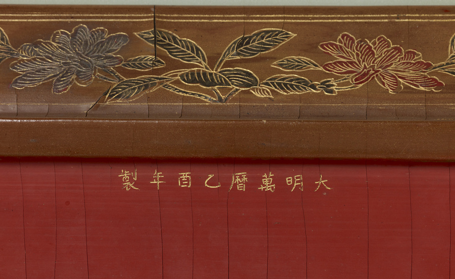 黄漆の地にさまざまな色漆を埋めて文様をあらわし、鎗金【そうきん】の技法で金色の輪郭線が加えられています。存星の技法は明時代後期にさかんに行われました。底裏は朱漆塗りで、「大明萬暦乙酉年製」と銘が記されており、万暦13年(1585)に製作されたことが知られます。