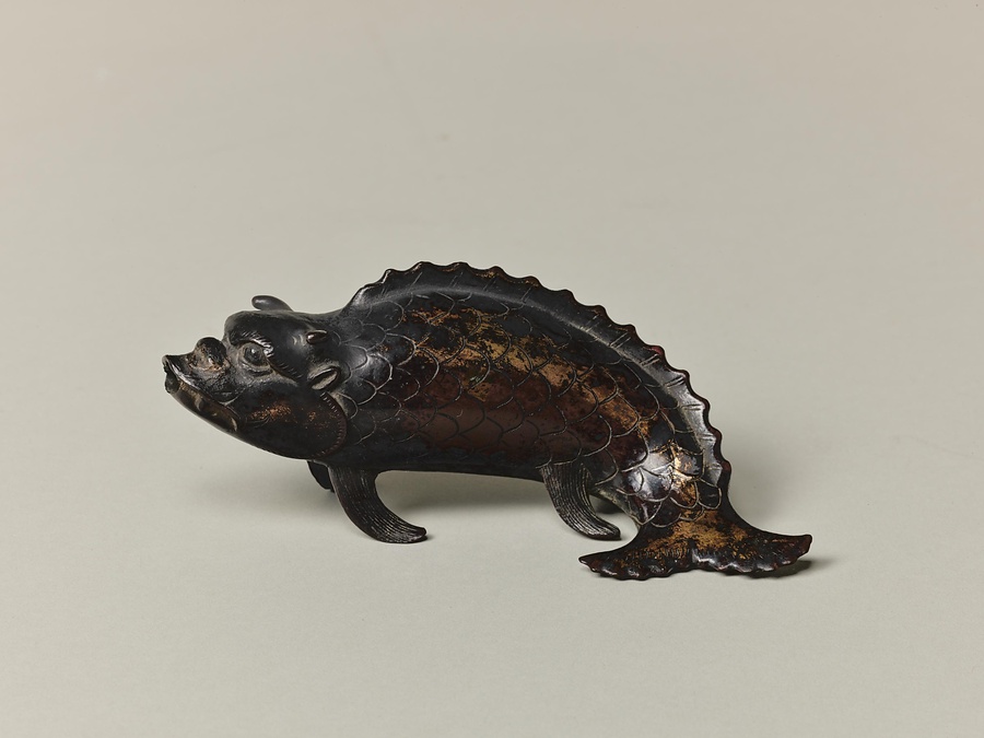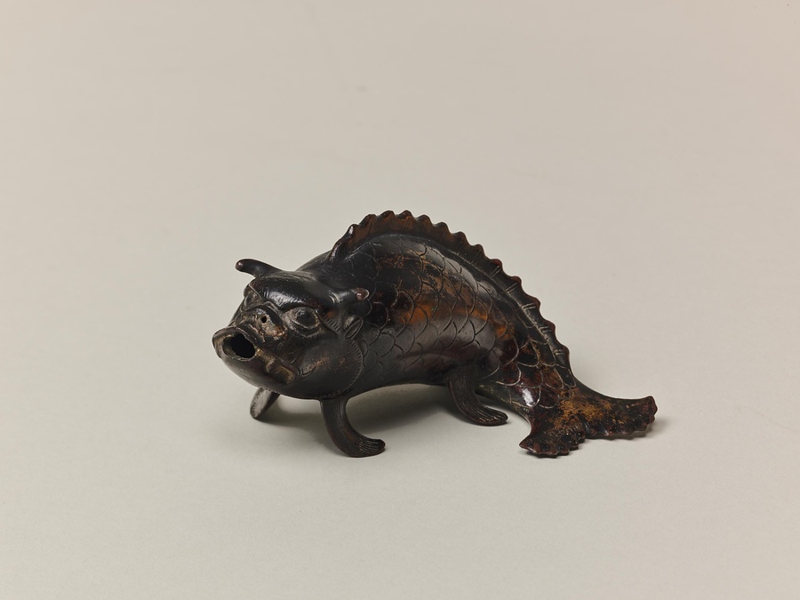 水滴は墨を擦【す】る際に硯【すずり】に注ぐ水を入れる容器です。江戸時代には蝋型鋳造法【ろうがたちゅうぞうほう】の発達もあり、動物、植物、人物など様々な形のものが作られました。登龍門【とうりゅうもん】の故事を踏まえ、鯉が龍に変わろうとする瞬間を表したこの水滴には、学問の成就【じょうじゅ】を願う気持ちが込められていると思われます。