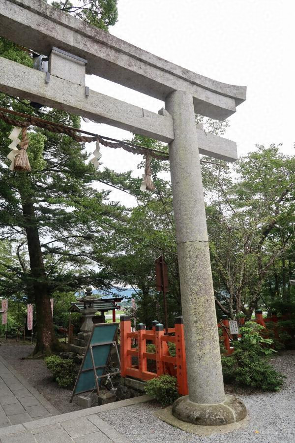 参道屈曲部北側の低い石段上に建つ、花崗岩製の明神鳥居。直径五七センチメートルの円柱を間口四・八メートルに立て、貫で固め、島木、笠木を渡す。島木と笠木は両者全長を一材から造り出す。氏子の寄進により建立された、良材による堅実な作りの石鳥居。