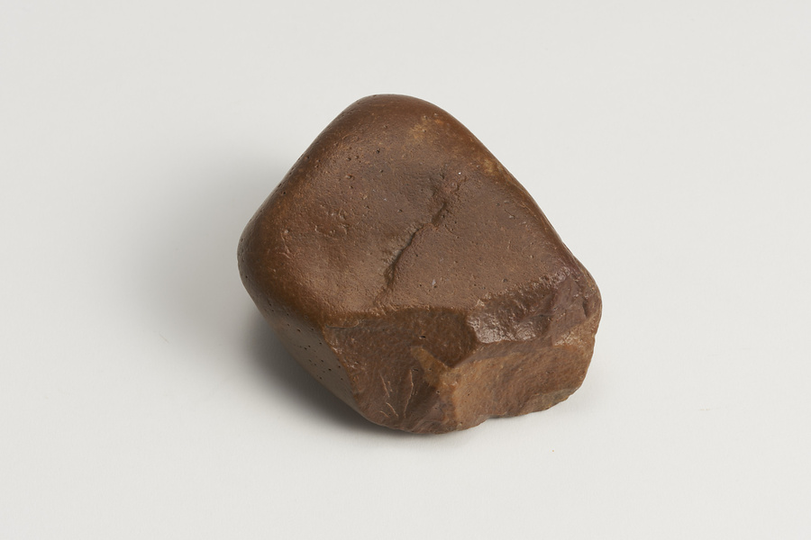 初期人類が使用した石器。表面は砂漠の砂に揉まれたためか、角が少し取れている。約500万年前以降のアフリカ大陸においてサルからヒトへと進化した人類は、約300万年前に石器を作り出した。石器の製作と使用は脳や身体の発達を促し、人類の進化に大きな影響を与えた。初期の石器は、本品のような亜角礫・亜円礫の一端を直線状に粗く打ち欠いて刃部を作り出した簡単なもので、礫器と呼ばれる。