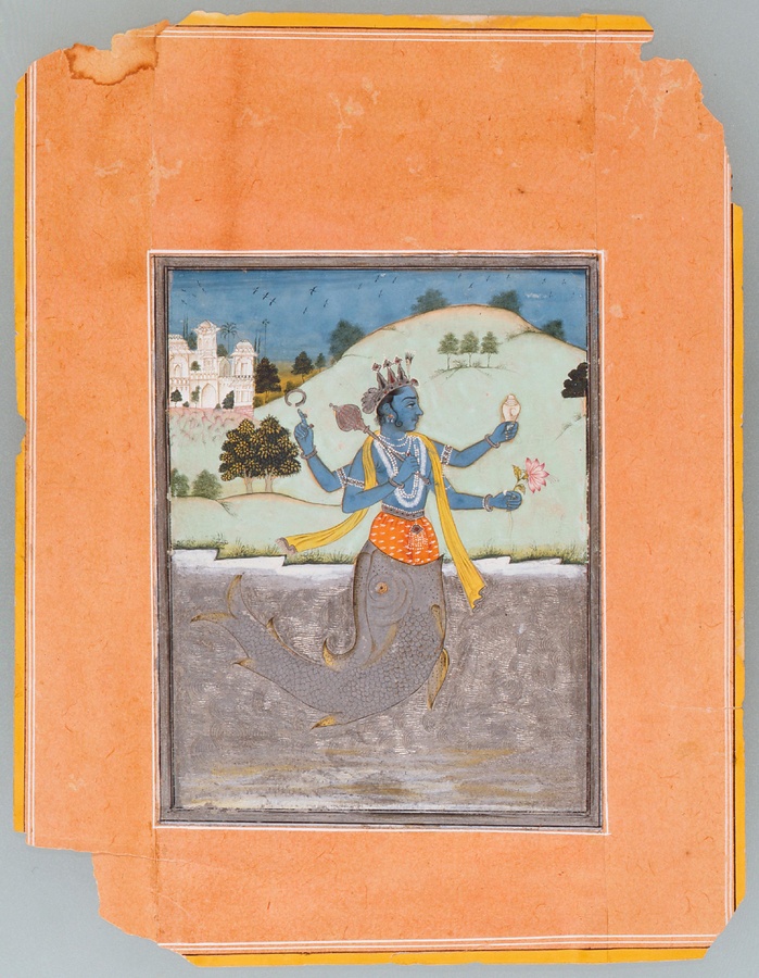 この作品はインド西北部(せいほくぶ)に位置するラジャスターン地方のビーカーネール地域の特色をもつ細密画です。ヒンドゥー教では、神ヴィシュヌが善を守り、悪を滅ぼすために、さまざまな姿に化身して、この世に現れると信じられています。ヒンドゥー教では、これを「アヴァターラ」といいます。ヴィシュヌには、魚、亀、猪、人獅子(じんしし)など、10の化身があるといわれており、魚に化身したヴィシュヌをマツヤ・アヴァターラといいます。「マツヤ」は魚という意味です。