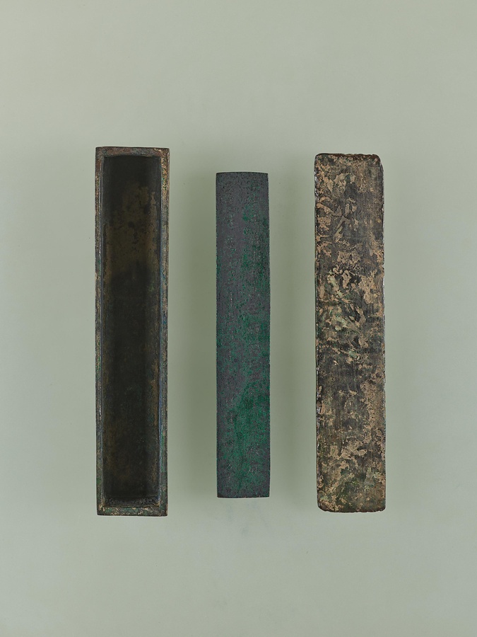 銅板で作られた飛鳥時代の墓誌です。江戸時代に、現在の奈良県宇陀市(うだし)で農作業をしていた農民が金銅製の箱に入れられているのを見つけました。金銅製の壺も一緒に出土しており、中には火葬された骨の灰が詰まったガラスの壺が入っていました。埋められていた穴には木炭がしかれていたことがわかっています。