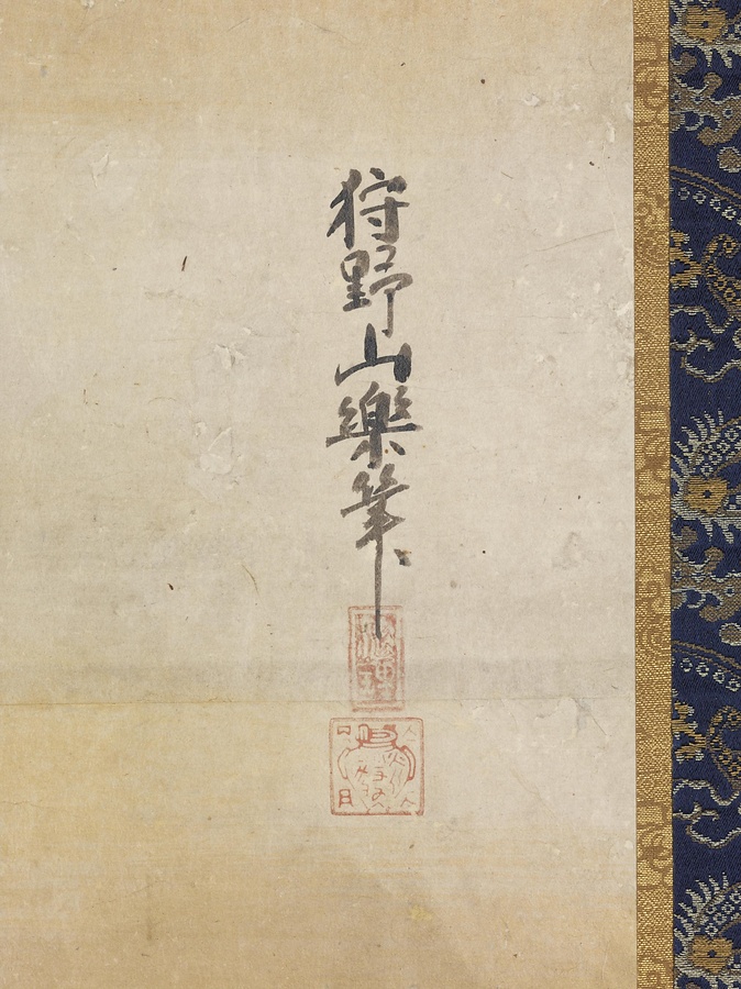 中国の身分の高い人々の間では、世俗を離れ、山奥で詩を詠みながら静かに暮らすことに対する強い憧れがあり、このような山水図が多く描かれました。その影響を受けて、日本でも室町時代以降盛んに山水図が描かれ、禅宗の寺院や、武家屋敷を飾りました。この絵は、右上の落款(らっかん)から、狩野山楽(かのうさんらく)(1559~1635)のものとされています。右上から左下へ、対角線上に岩や水辺を配置した安定した構図と、近くの水辺や道、中ほどの岩山、遠くの山々と、広がりを感じさせながらもまとまった遠近感は、狩野派の山水図の特徴をよく表しています。