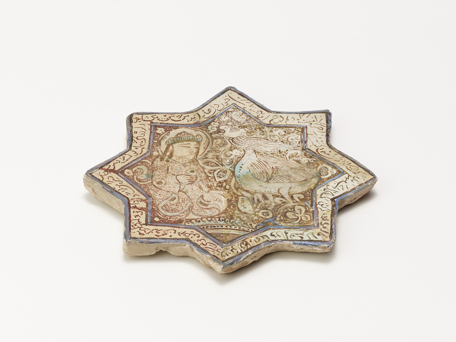 正方形2個を45度ずらして重ねて八稜星形に作る。八稜画面の外側を巡る白い区画には倣文字文(文様化した文字)が書かれ、内側の八角形部分には坐る人物と頭をもたげた鳳凰を思わせる瑞鳥が向かい合わせに描かれている。人物は左手を膝に、右手には持物を取っている。周囲には草花や大きな植物が描かれ、天国を連想させる庭園を表現しているものと思われる。輪郭線や大きな植物の茎などには藍色の絵具が用いられている。白釉で全面を覆って高火度焼成後、酸化金属の絵具で動物や植物文を描き、再度低火度還元焼成により、金属の光沢を得ている。こうした八稜星形タイルは、セルジューク朝期以降、盛んに王宮などの世俗建築物の内外装に用いられるようになった。