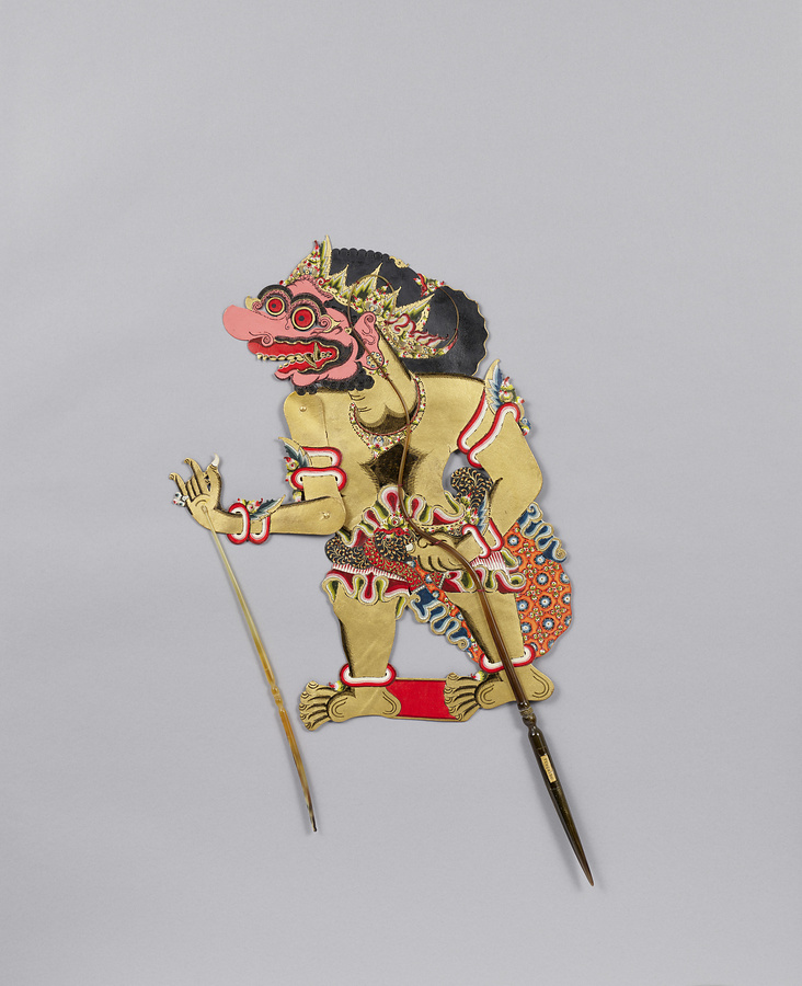 インドネシアの伝統的な影絵芝居ワヤン・クリで用いる人形。スイギュウの革を切り抜いて透彫し、金彩と彩色の後に、可動部分をつなぎ、水牛の角製の棒をつけたもの。人形遣いダランが多数の人形を一人で操りつつ台詞を語り、観客は白幕に写った影も、ダランが人形を操るさまも、自由に鑑賞できる。この人形は、民族造形学者・金子量重氏が収集した、『ラーマーヤナ』を上演するための一そろいのワヤン・クリのうち1体。