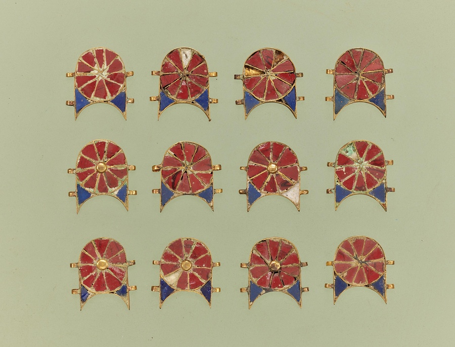 おそらく、エジプト王トトメス3世に嫁いだシリア・パレスチナ出身の3人の王妃たちの墓から出土したもの。金の薄板を加工して作ったロゼット文様の土台に、色ガラスや宝石を象嵌しています。エジプトの国力が飛躍的に増大した時代の煌びやかな王妃の装いを伝えています。ルビ:ぞうがん、きらびやか