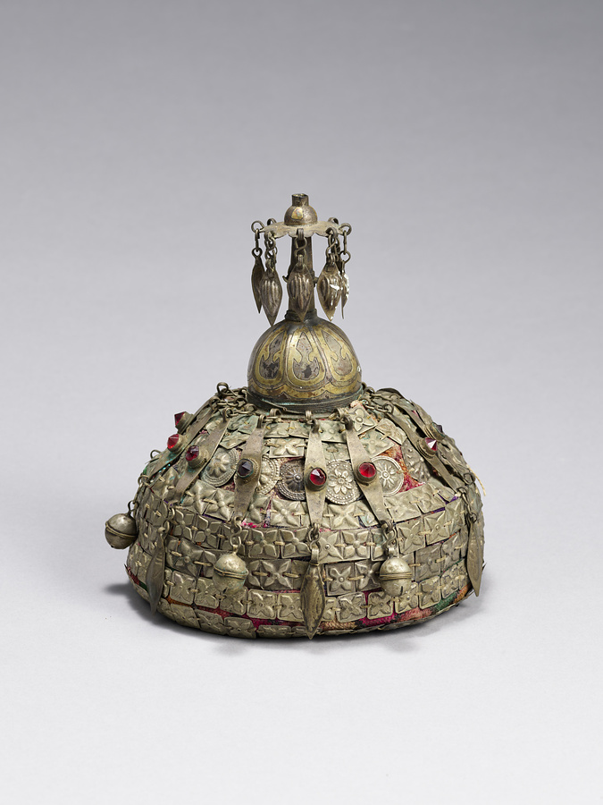 布地に多数の銀板を取り付けた帽子。この飾り付き帽子は、トルクメニスタンを中心にイラン、アフガニスタン、パキスタンなどに居住するトルクメン人、特にテケ族の手によるものである。単なる装飾にとどまらず着用者の社会的立場を示すものである。正確な制作地については今後の継続調査が必要であるが、帽子に金属板を多数取り付けるのは中央アジアの諸民族にみられるものであり、本品は当地の造形を窺う上で貴重な資料となりうる。