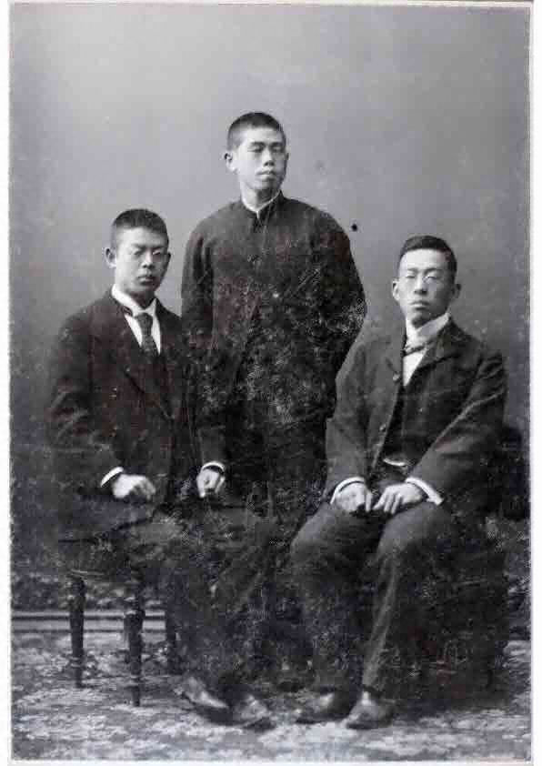 直入郡高等小学校の同級生2人と撮影した写真。左端に写る廉太郎は、東京の麹町小学校尋常科を卒業後、父母の住む大分市に帰り、父が直入郡長に任じられた後は竹田市に移って直入郡高等小学校2年生に転入している。
