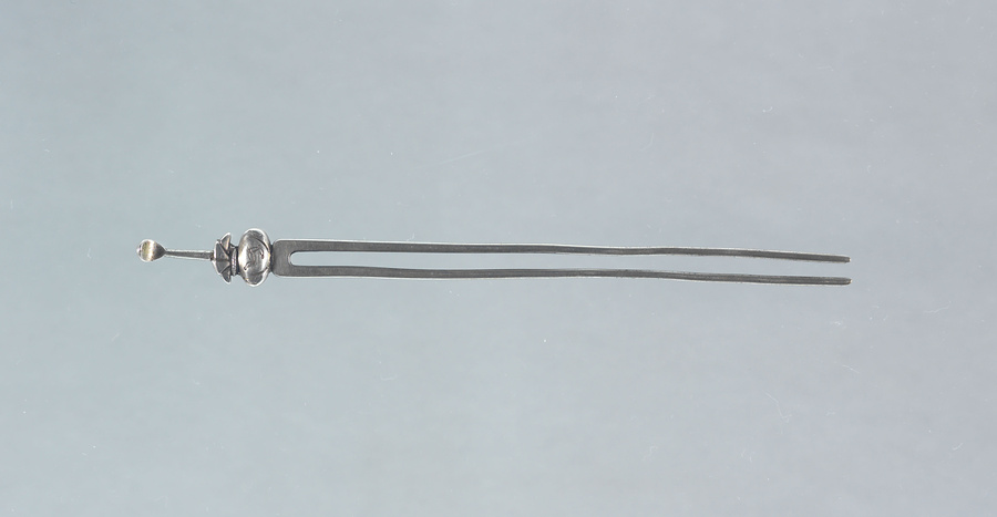 銀製二本足の簪。七宝文を表した砂金袋を容彫としている。簪は笄から分化して発生し、二本足の簪は享保以降に出現した。延享元年(1744)に金銀製の櫛・笄が禁止されてからは象牙・鼈甲・錫が用いられたが、寛政頃から金銀製の簪が再流行した。花柳章太郎(1894~1965)の旧蔵品で平成15年(2003)に遺族の青山久仁子氏より国立劇場へ寄贈された。