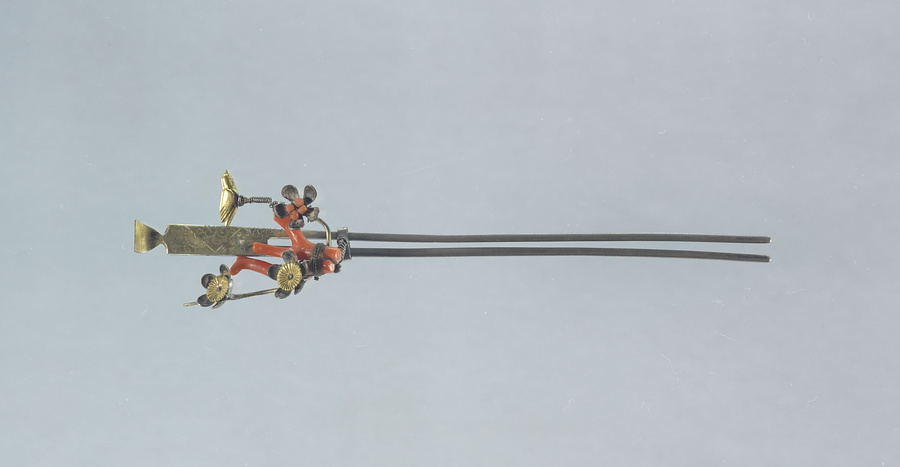 銀製金色絵、角耳、二本足の簪。簪部分は銀製に寄裂文の毛彫に金色絵で、枝珊瑚と銀の梅に金銅の鶯の飾りを差込式で取付けている。簪は笄から分化して発生し、二本足の簪は享保以降に出現した。延享元年(1744)に金銀製の櫛・笄が禁止されてからは象牙・鼈甲・錫が用いられたが、寛政頃から金銀製の簪が再流行した。花柳章太郎(1894~1965)の旧蔵品で平成15年(2003)に遺族の青山久仁子氏より国立劇場へ寄贈された。