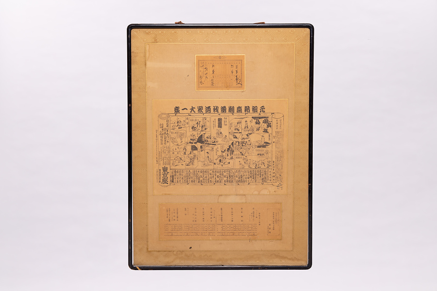 明治38年(1905)6月1日に開演した、曾我廼家十郎・五郎一座の東京座公演の辻番付。前年2月に道頓堀五座の一つ、浪花座で興行を行った十郎・五郎一座は、続く京都朝日座や神戸朝日座で人気となり、この年4月には早くも新富座で初の東京公演を行った。6月の東京座公演は5月の市村座に続くもので、初期の代表作「無筆の号外」「喜劇十八番の内 忠臣蔵」等を出したが新富座・市村座と異なり集客に苦労したようで10日で打ち上げ、横浜・喜楽座に移っている。