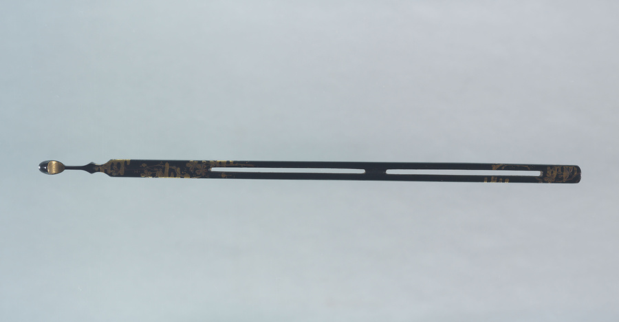 胴の2箇所を中空に透かした中差。胴を透かして足先を繋いだような形状の簪は、『守貞謾稿』では「中差徳利形」と記され、江戸では従来からあって京阪では見ないという。また『玳瑁亀圖説』によると江戸で文化年間に発生し、幕末には「光輪足」とも呼ばれている。霞に桜を高蒔絵で表し、耳掻きの内も金地としている。花柳章太郎(1894~1965)の旧蔵品で平成15年(2003)に遺族の青山久仁子氏より国立劇場へ寄贈された。