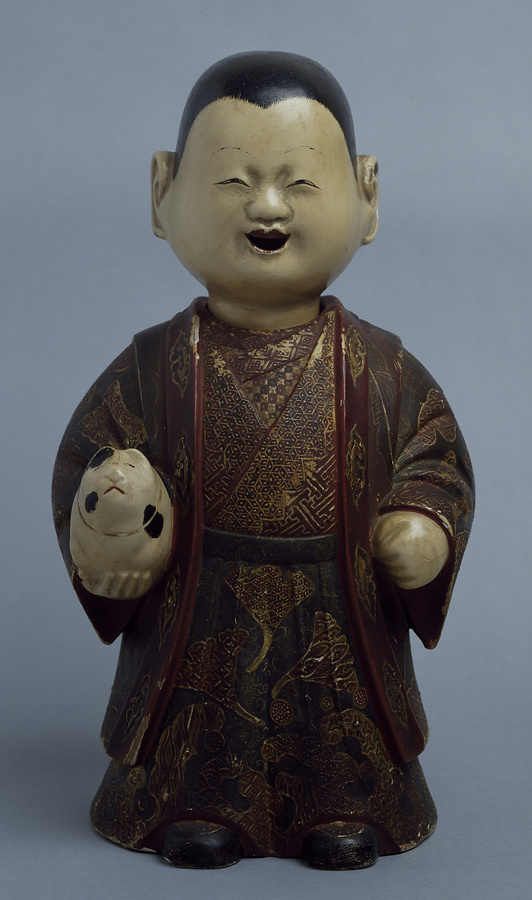 木彫りに彩色をほどこした人形。年月の経過によって沈んで見える衣裳の色調は、当初は極彩色であった。江戸時代を通じて製作されたが、初期の嵯峨人形は深遠な表情に特色があり、多くは首振りなどのからくりが仕組まれている。本品も首が前後に動き、首の動きに合わせて舌が見え隠れする。