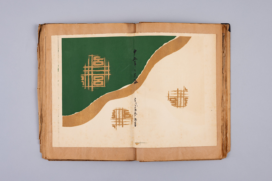 茶のボール紙製の表表紙に「脚本創作用 参考 新聞切抜集((4))」と万年筆で書かれている。新聞劇評をおもに切り貼りしたスクラップブックの筆跡とは明らかに異なり、五郎の自筆のように思える。前者は柏木泉蝶はじめ五郎劇脚本部の人間が作成したのだろうが、この「脚本創作用新聞切抜集」は文字どおり五郎が創作のために自分で切り抜いて作っていたものだろう。五郎は新聞で報じられた事件をもとに台本を書くことがよくあった。記事の日付を見ると、昭和14年(1939)のものが大半となっている。同年に出版された『十五年の足跡』の表紙見本も貼り付けてあり、自著の装幀についても五郎はこだわっていたことをうかがわせる。