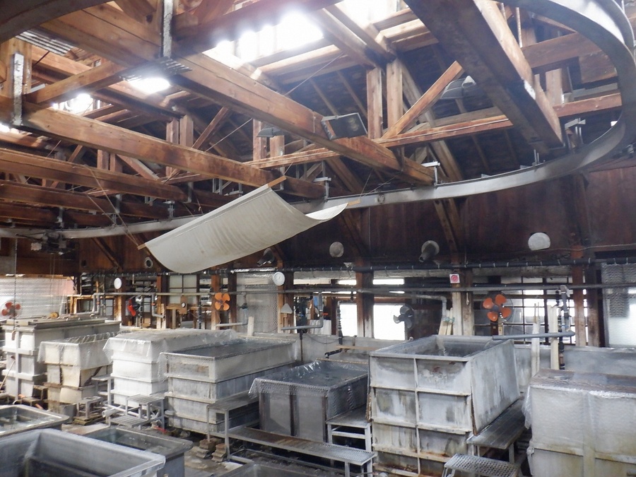 仕立棟の北側に位置し、絹織物を水槽で煮て不純物を除去する作業棟。L字形平面で切妻屋根頂部の越屋根と南・北面の開口から高熱の蒸気を排出。内部は土間で、生地を水槽に移動するレールをクイーンポスト・トラス下に設える。工場の中核をなす施設の一つ。