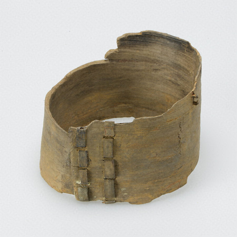 アイヌ文化期のものと考えられる木製品。桶のような円形容器の壁の部分であり、板材を曲げて筒状にし、サクラの樹皮で2列綴じ合わせて作られている。底部は残っていない。