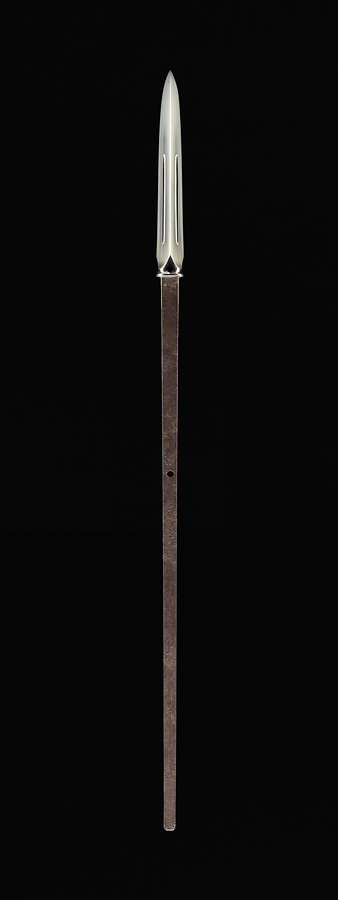穂に枝のない直槍。正三角造で、丸首をなし、各面の平に丸留の棒樋を彫る。鍛は小板目よく約み、地沸つく。刃文は直刃で浅く湾れ、帽子は直に先小丸に返る。茎は穂に比して長く、鑢目は表を切、裏をせんすきに仕上げる。先は浅い栗尻。目釘孔1つ開く。表に銘「薩州住元平」を刻す。元平(孝左衛門、1744-1826)は、江戸時代後期の薩摩を代表する刀工のひとり。天明5年(1785)に薩摩藩から「薩藩臣奥元平」と銘切することを認められ、更に寛政元年(1789)12月には伯耆守正幸と同時に大和守を受領した。以後はこの受領銘を刻したことから、本品の制作は受領以前の作と推定される。なお、子に同名(元平)がある。打刀に比して槍は現存作例が少ないこともあり、江戸時代における薩摩刀工の槍の作風を知るうえで貴重な作品である。