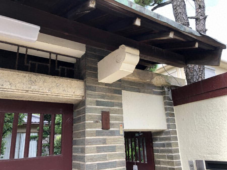敷地東辺に建つ鉄筋コンクリート造の表門で両脇に袖塀を付す。本柱上部に絵様付腕木を造り出し、軒桁を支え、屋根は切妻造銅板葺で棟に桟瓦を載せる。本柱間に開き戸を吊り、北脇に潜戸を設ける。本柱と袖柱は緑色のタイル貼で、和洋折衷の意匠とする門。