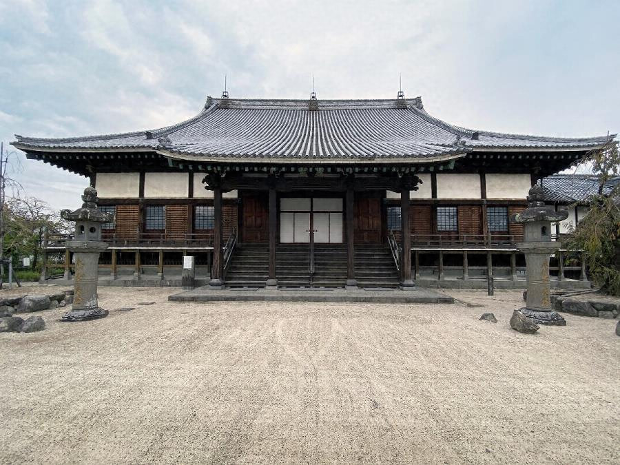 佐賀城跡北に建つ真宗寺院本堂。正面九間、奥行八間半、入母屋造本瓦葺。外周は大斗と実肘木、中備蟇股等簡素。平面は標準的だが、内外陣境を欄間彫刻で飾り、矢来前面に長大な虹梁を架けて彫刻で飾る。当地の中心的真宗寺院で九州有数の規模と古さを持つ。