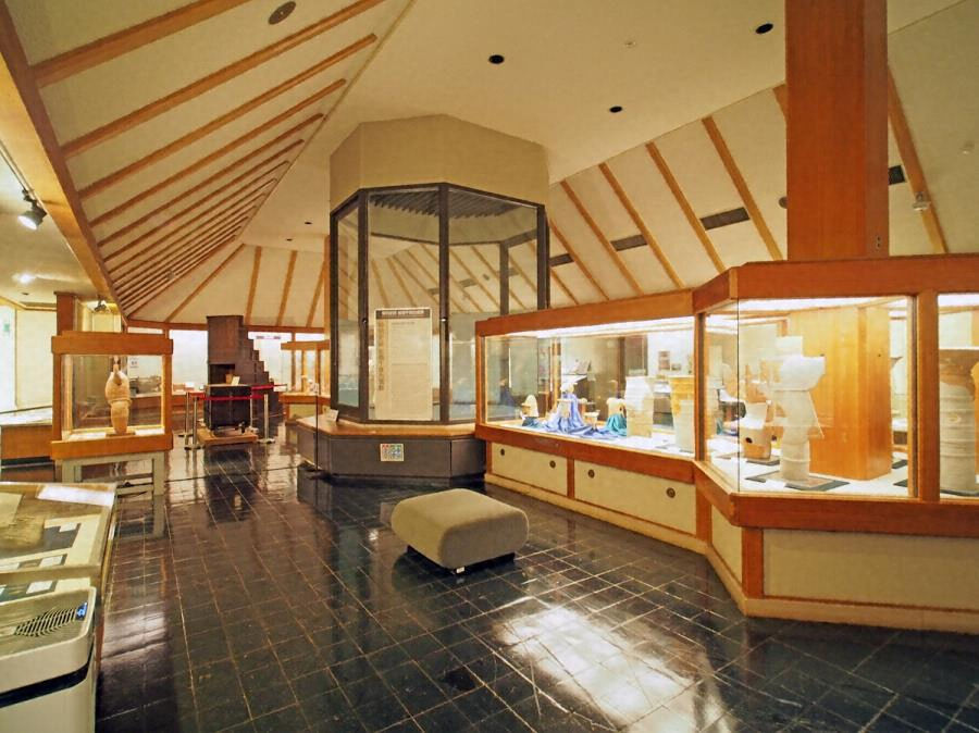 古墳群の傍らに建つ浦辺鎮太郎設計の鉄筋コンクリート造博物館施設。土塁等で設計条件のボリュームを抑えた外観を実現する。大面取りピラスター、長押形水切、青石貼りの壁、銅鐸文様面格子など古代から着想を得て、モダニズムを基調としつつ景観に溶け込む。