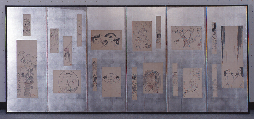 19点の俳画を屏風仕立てにしたもの。それぞれに印章の朱文円印(描印「○ス」・「杉」など)がみられる。人物や動物、植物などの画が描かれている。