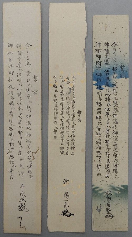 国学者矢野玄道の門人が、入門の際に提出した誓詞。子孫宅に残っていた本資料の門人は144名で、大半を神職が占め、その他には藩士や地域の有力者が確認できる。全国各地から門人が集まっており、そのうち伊予出身者が約3割含まれる。主な門人は熱田神宮(現愛知県名古屋市)大宮司角田忠行の子息二人をはじめとして、玄道を補佐した後に皇學館館長等に就任した木野戸勝隆や皇典研究所委員等をつとめた伊曽乃神社(現愛媛県西条市)大宮司加茂百十(ももとお)等があげられる。
